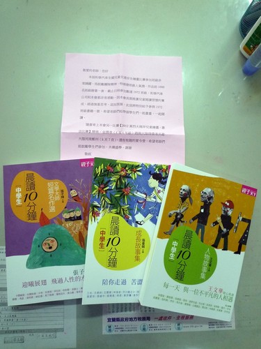 收到來路不明的包裹!!作者:連振翔2012 年 5 月 7 日2021 年 3 月 18 日中午收到來路不明的包裹,心想奇怪~最近又沒有網購,怎麼會有這東西,莫非有人挾怨寄個炸彈包裹給我!我還小心翼翼地拆開它,結果掉出三本書喔,原來是開學時全班一起參加繪畫比賽所得到的贈品,還真不賴,全班參與就能得這個獎勵品,以後應該要多辦這種類似的比賽~為班級圖書多進補些新品!晨讀十分鐘系列-文學大師短篇名作選成長故事集人物故事集