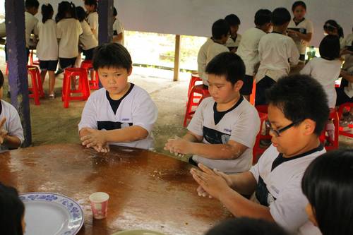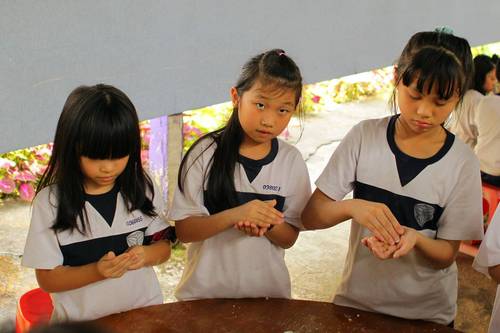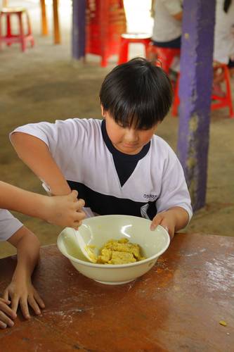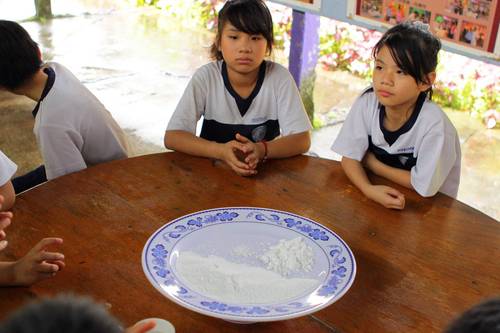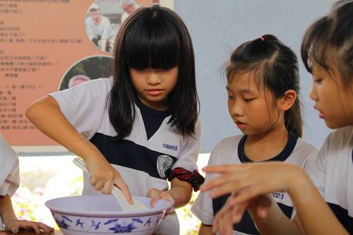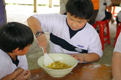 ↓Fish姐姐要我們大家輪流混合盤上的粉狀食材.
