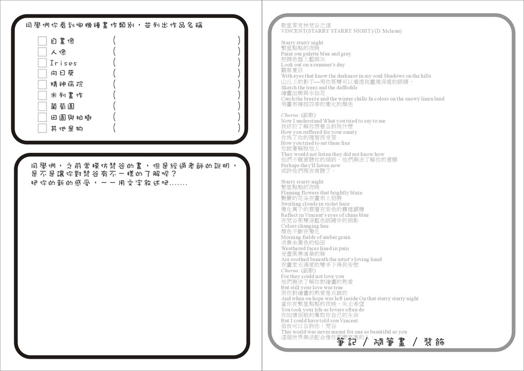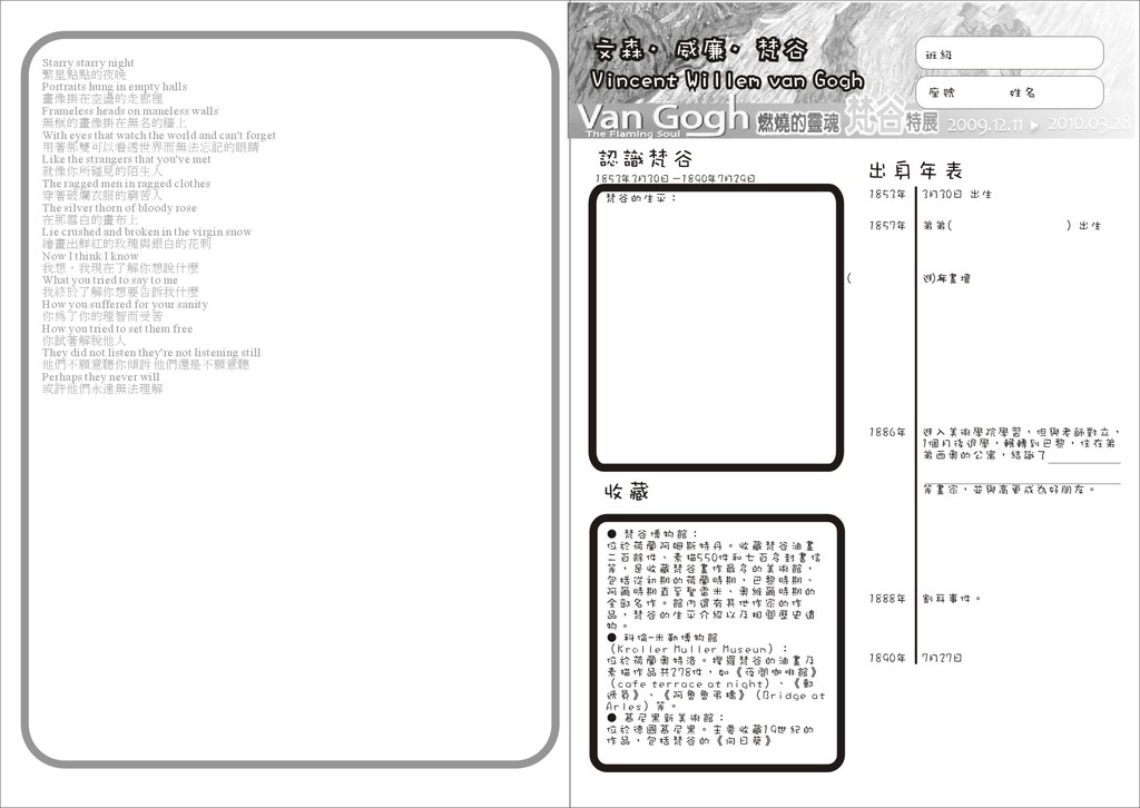 梵谷學習單作者:hsiao1032009 年 12 月 25 日 請注意囉~如果遺失弄髒,請按此重新列印吧1.出生年表—除了,將空白處填寫完畢,可記錄他在( )時期的重要紀事—舉例:奴南時期是在哪一段時間呢???2.空白頁,請做 筆記 / 隨筆畫 / 裝飾插圖 ,擇一即可。