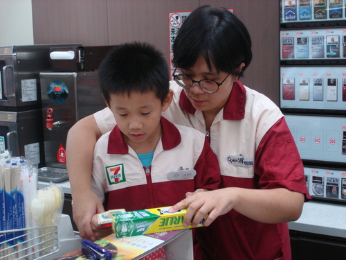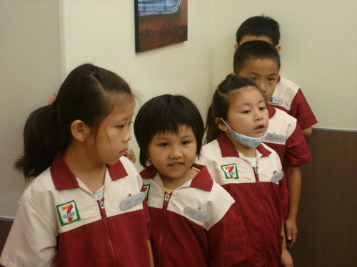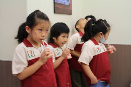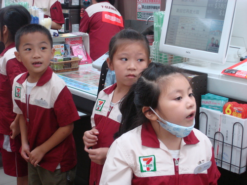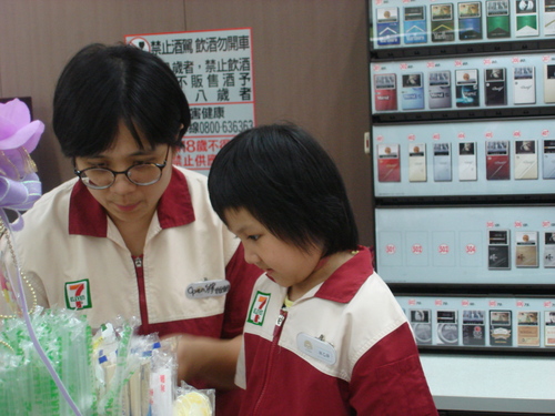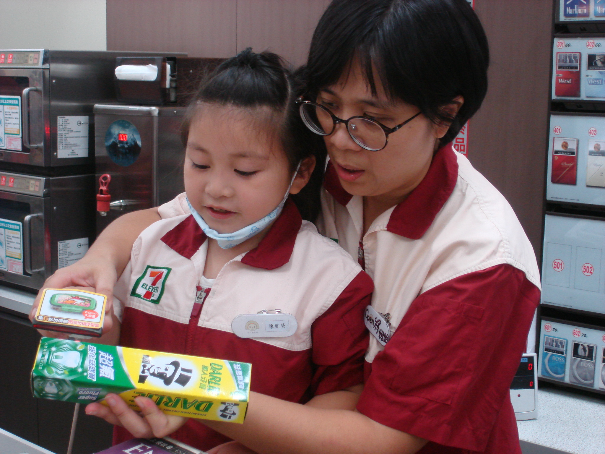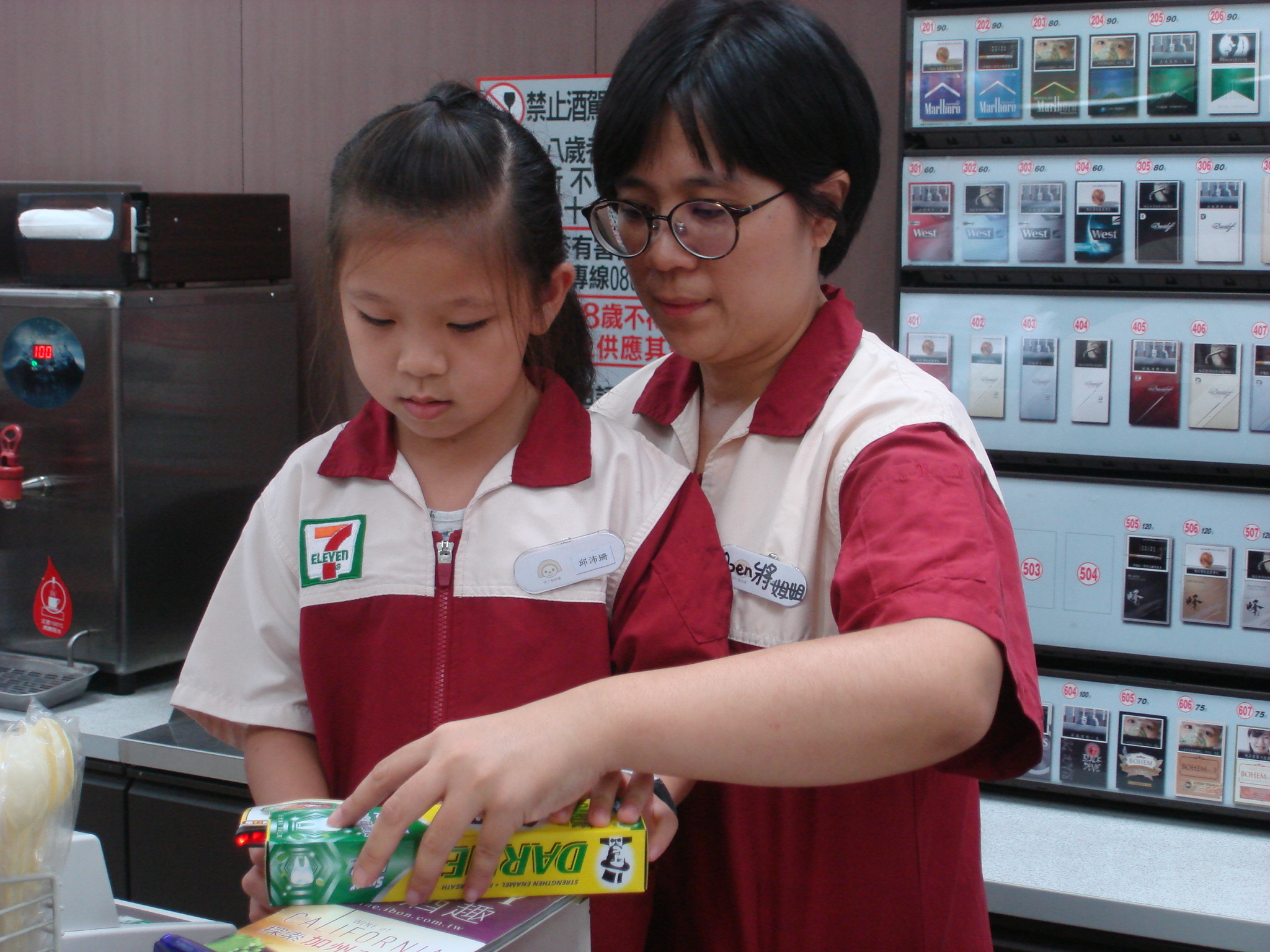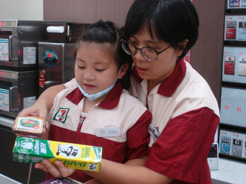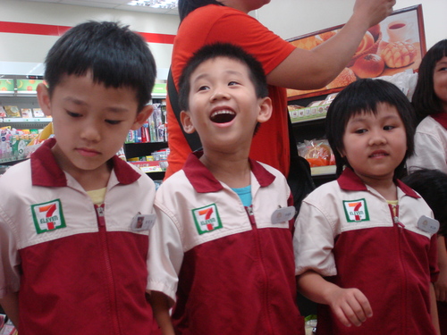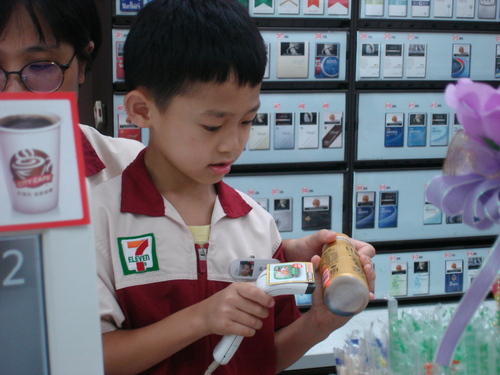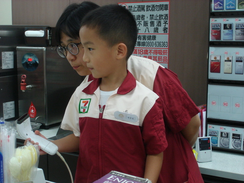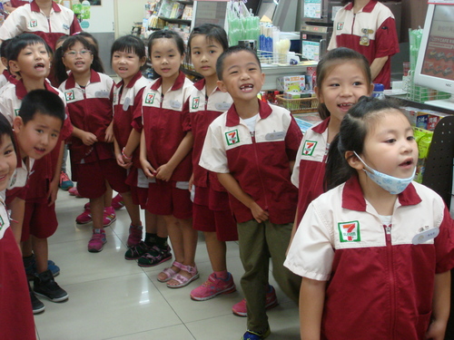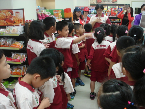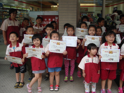 7-11小小店長體驗今天孩子們到7-11龍潭分店進行小小店長體驗活動,孩子們都收穫滿滿的回到學校。謝謝店長的邀約並細心規畫整個行程,也感謝OPEN醬姐姐的細心解說及示範。謝謝威德爸爸到場關心,感謝乙錚爺爺請大家喝養樂多。領證書了[@more@]養樂多真好喝專心的聽OPEN醬姊姊說明為迎接客人,正排隊練習中引頸期盼客人到來等待客人中列隊歡迎客人,齊聲說:「您好,歡迎光臨!」乙錚收銀體驗庭瑩在姐姐的協助下幫客人結帳沛珊在姐姐的指導下幫客人結帳威德刷條碼體驗景堯幫客人結帳琮富刷條碼體驗