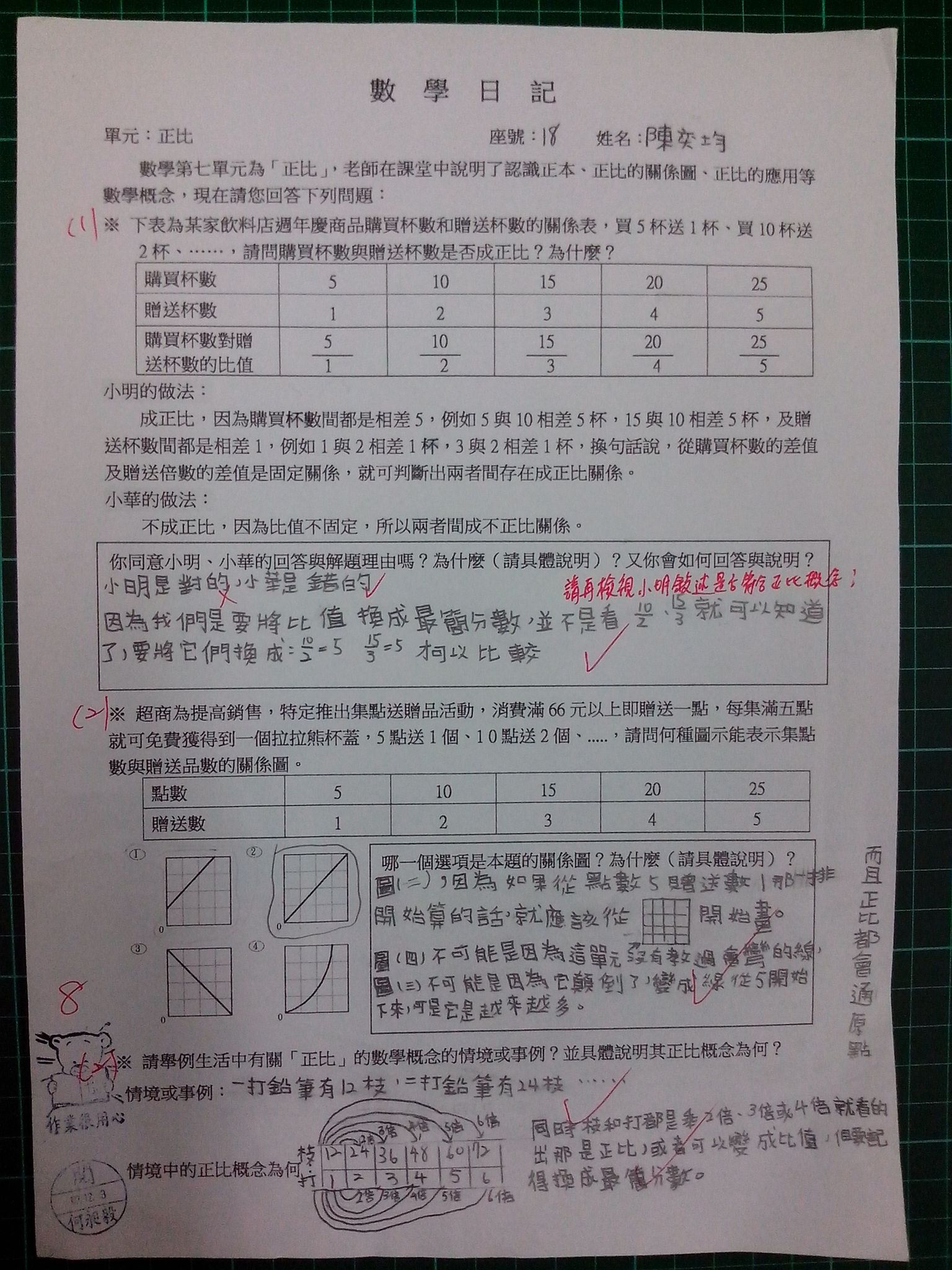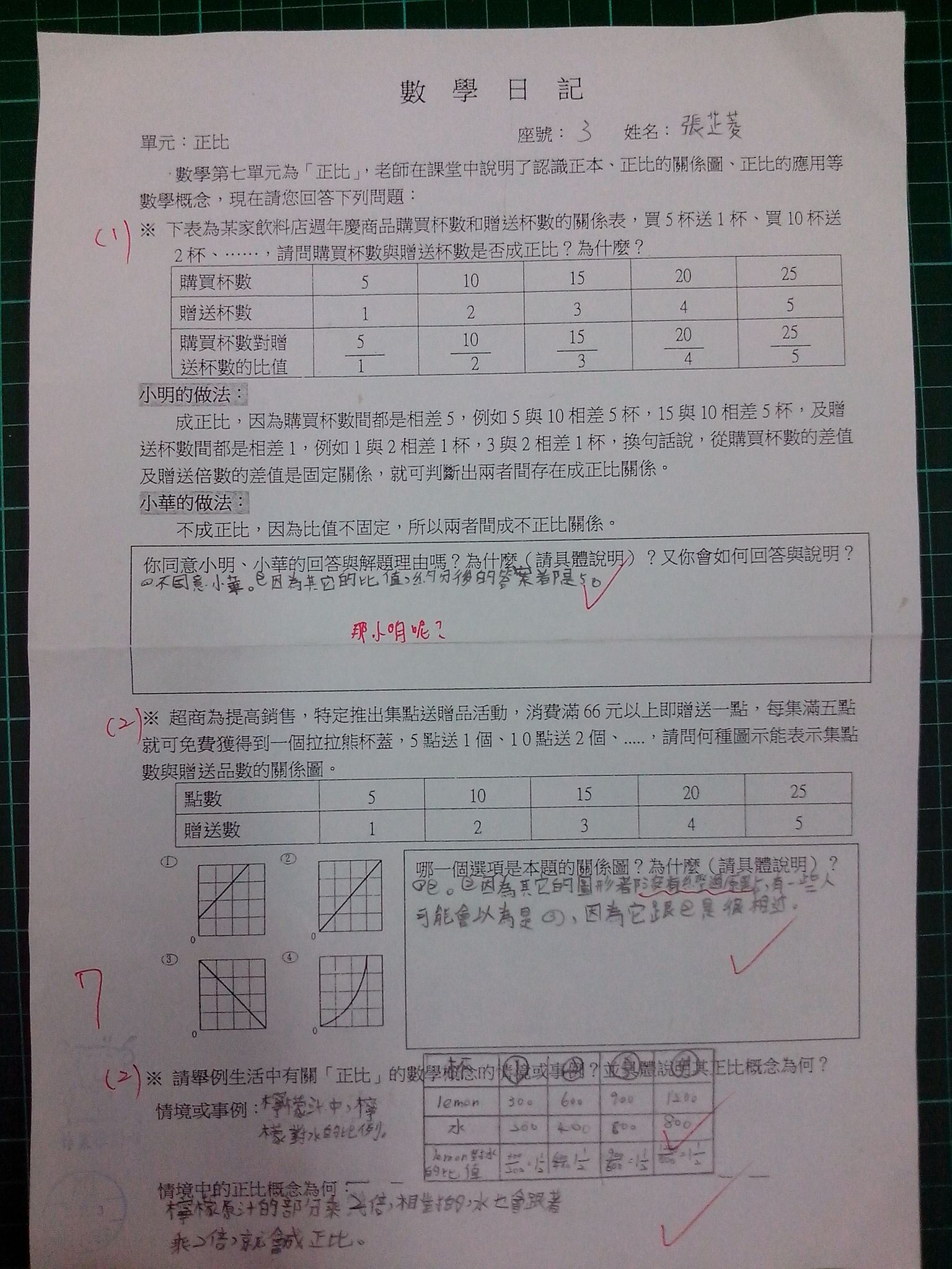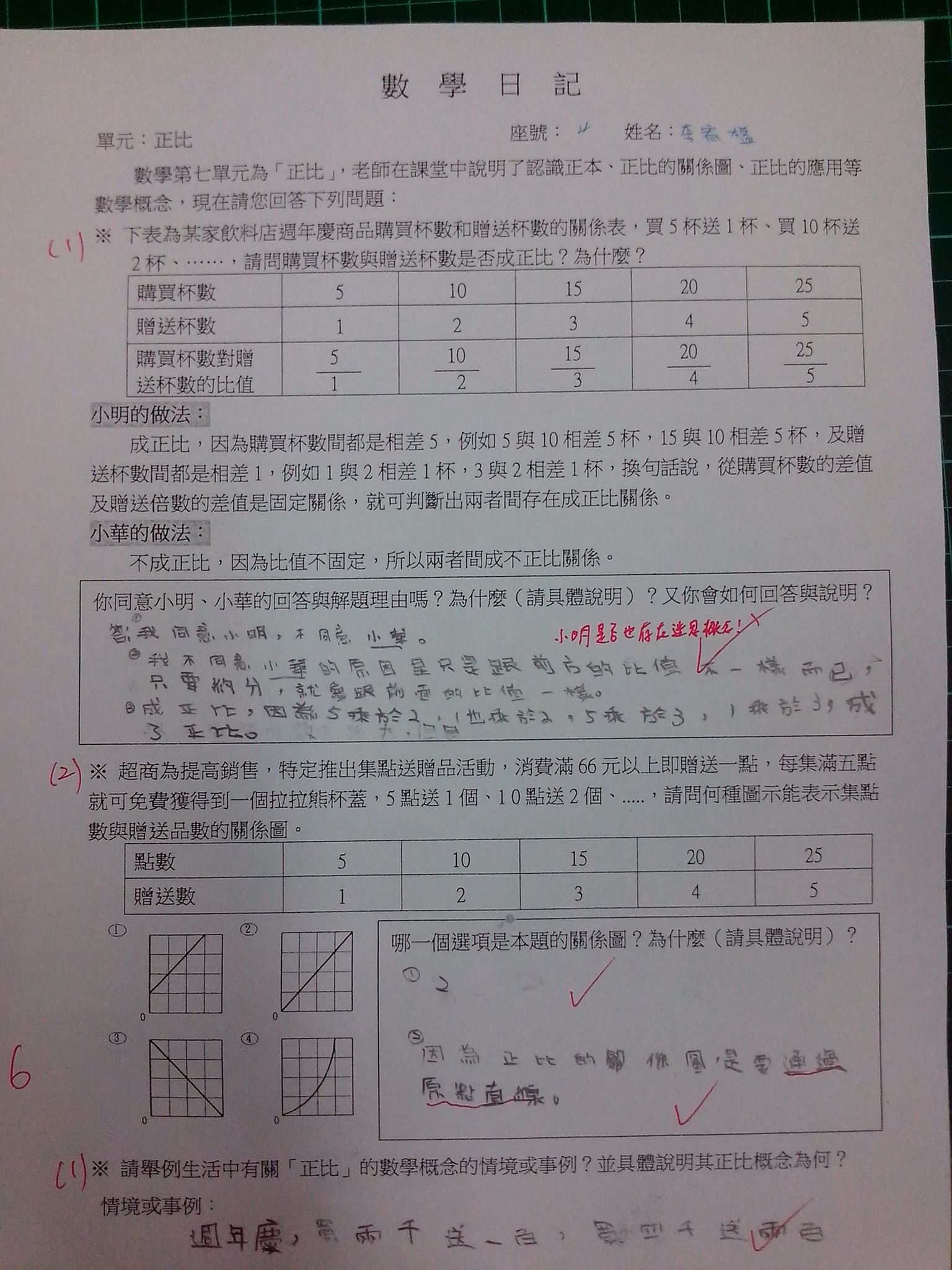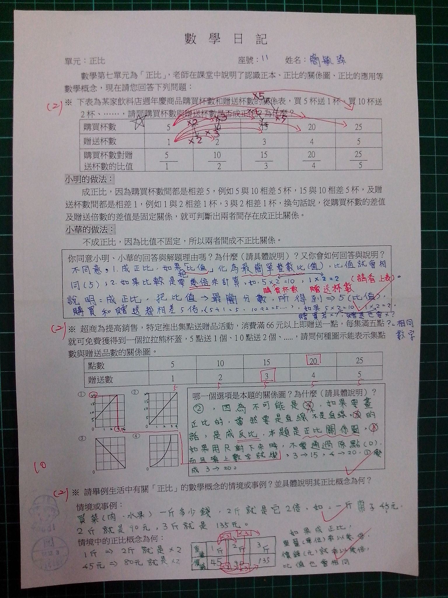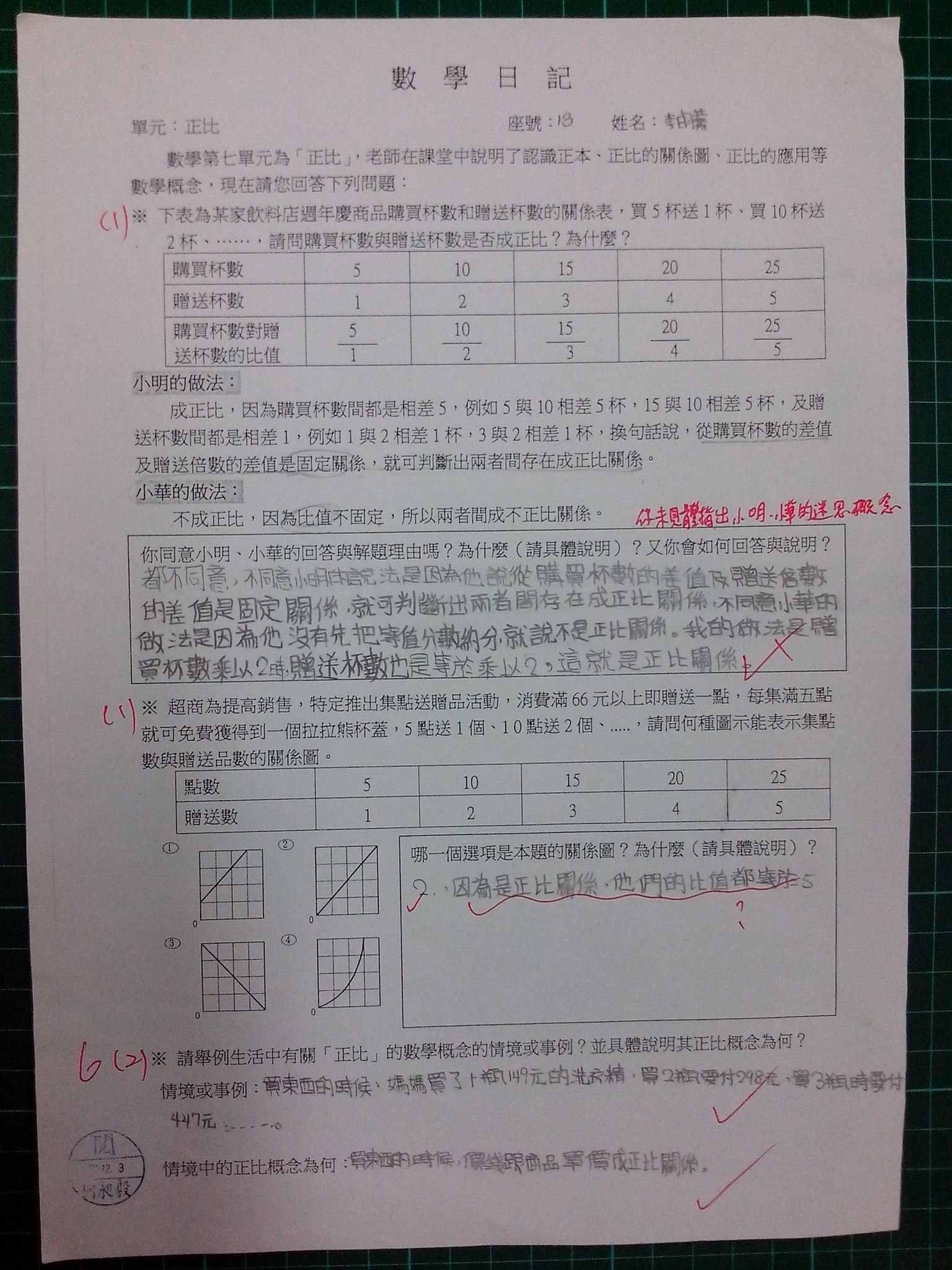 為瞭解學生數學概念及檢視其迷思概念,特設計數學日記,透過文字敘述、解題批判、及概念辯證以提升學生數學學習能力,以下為學生數學日記的作品(正比):