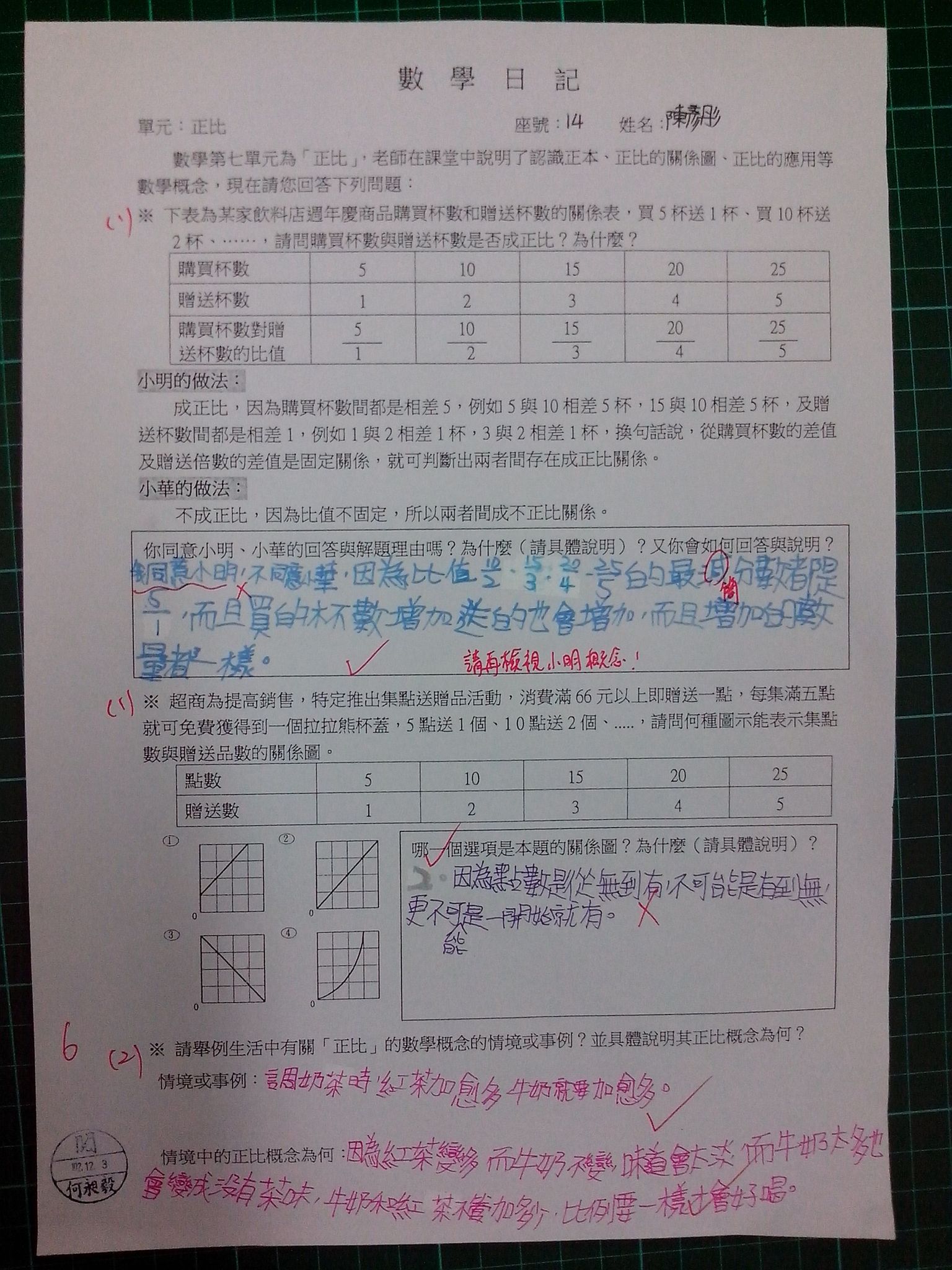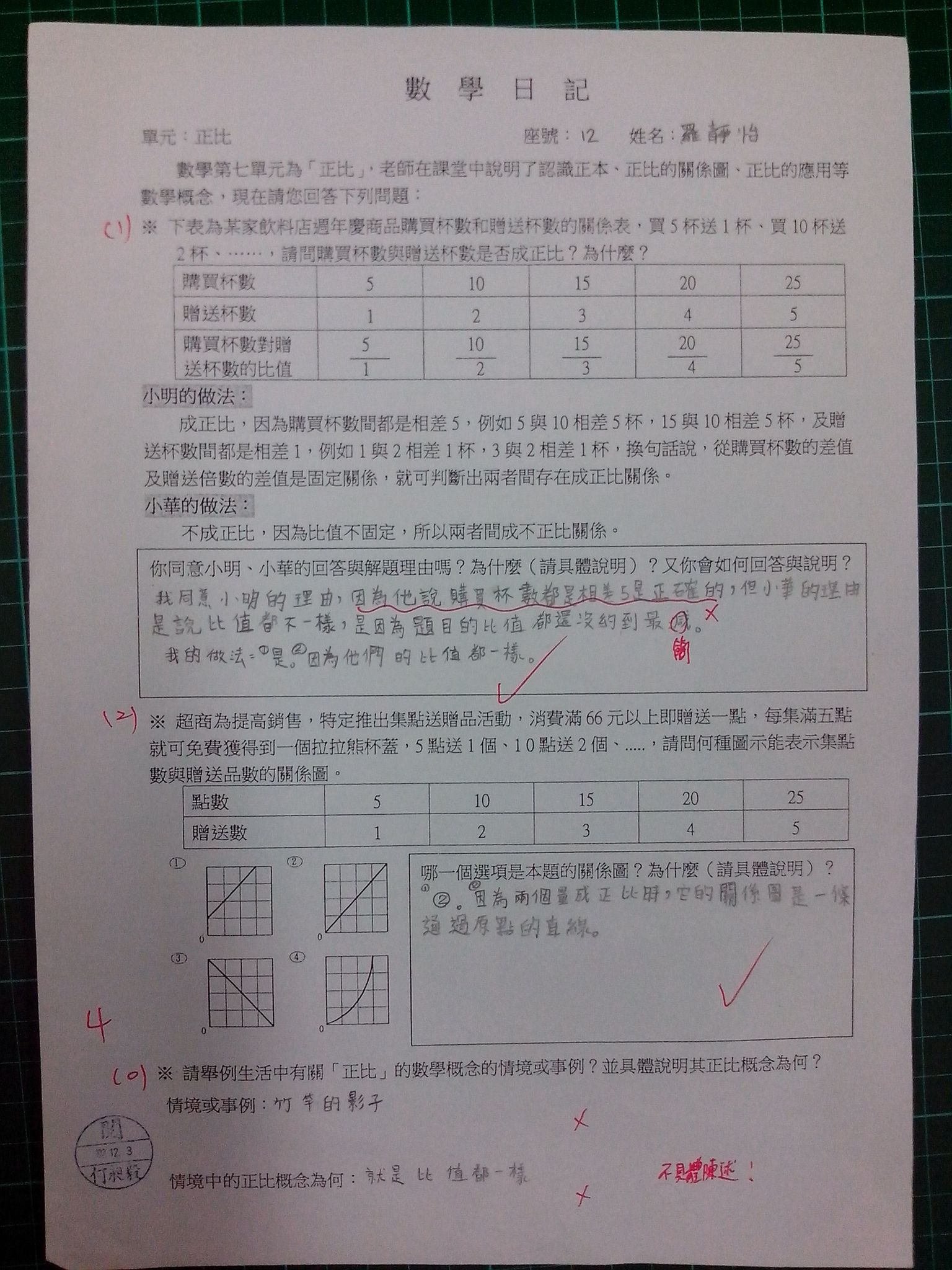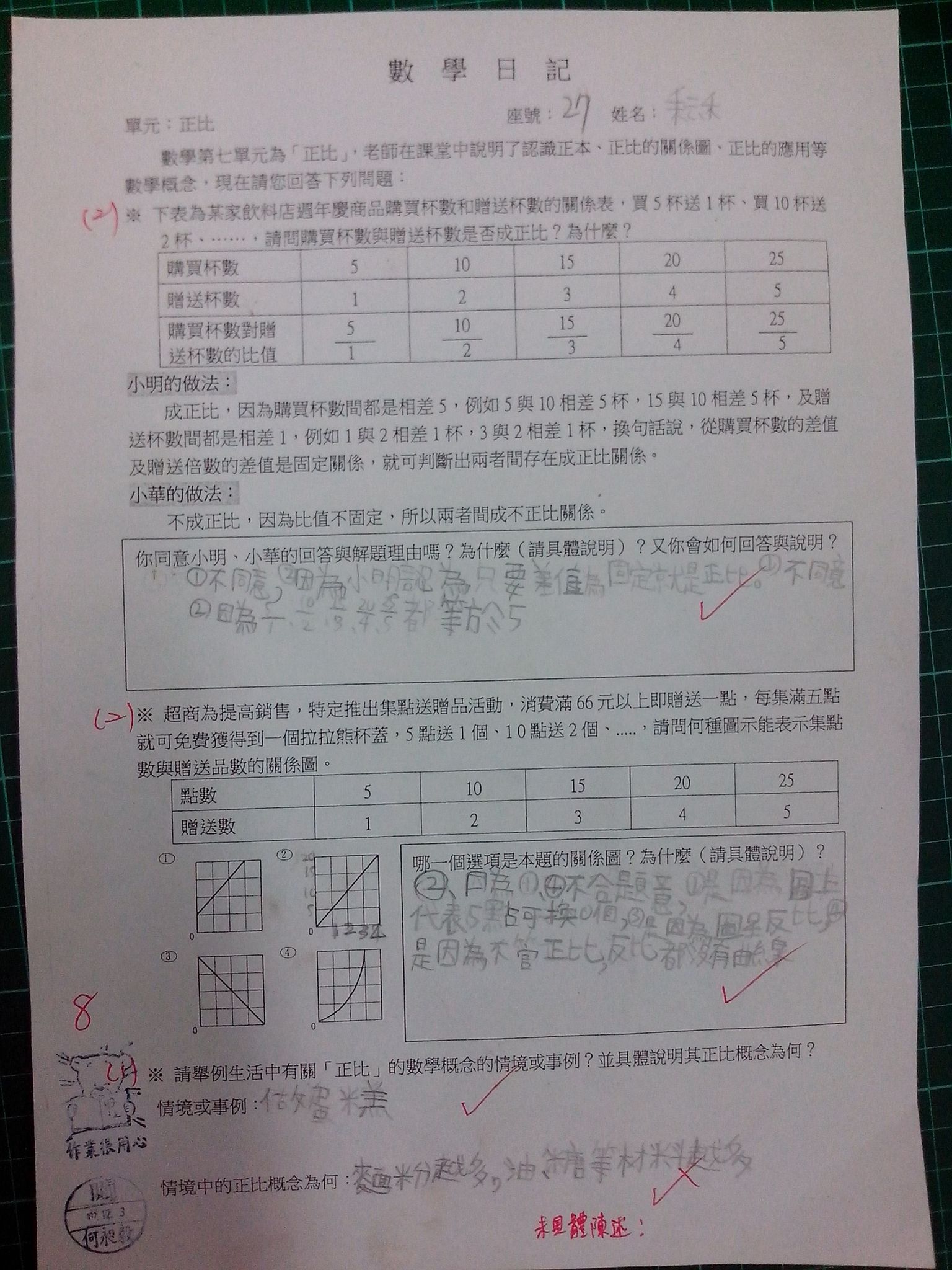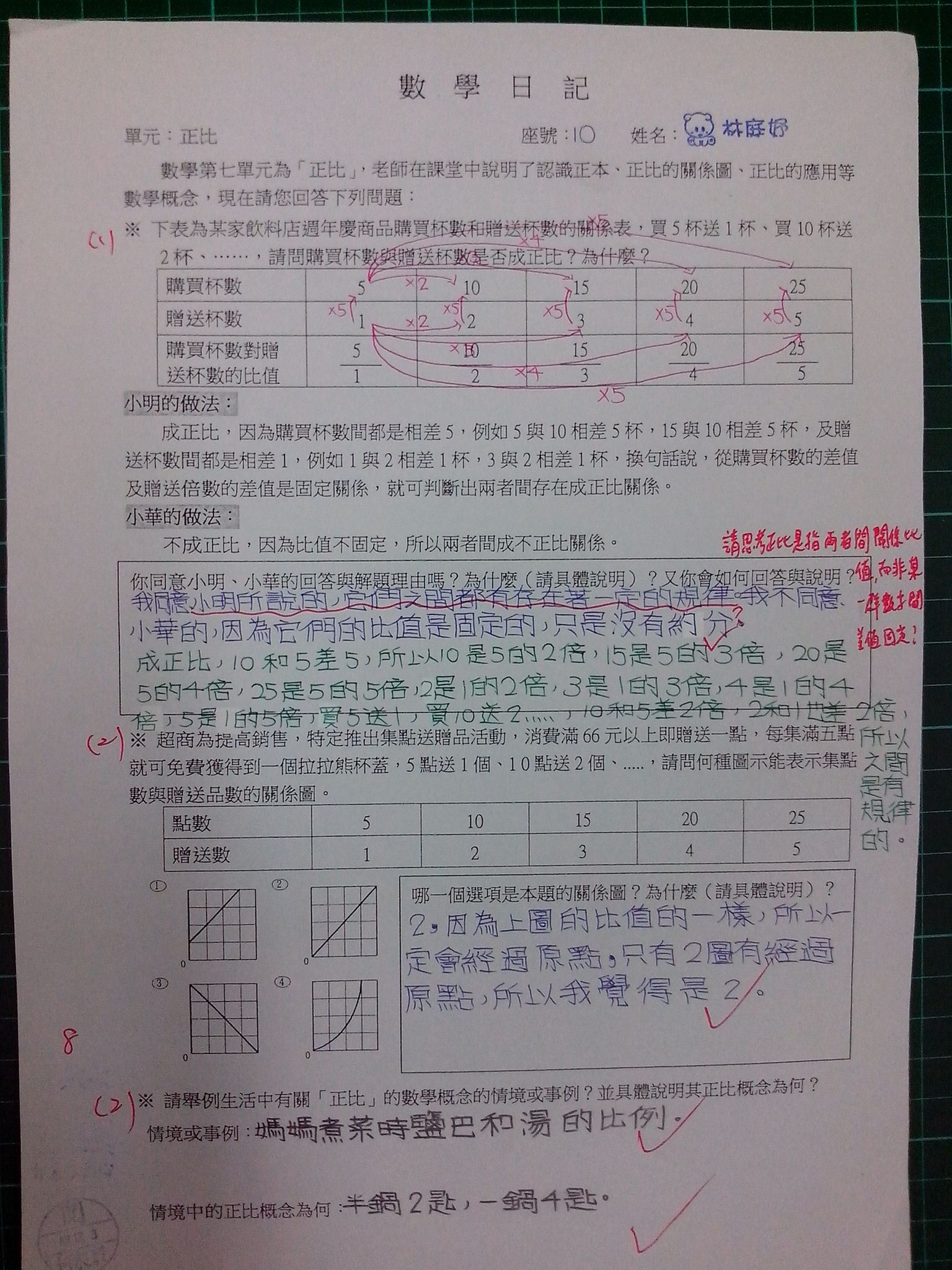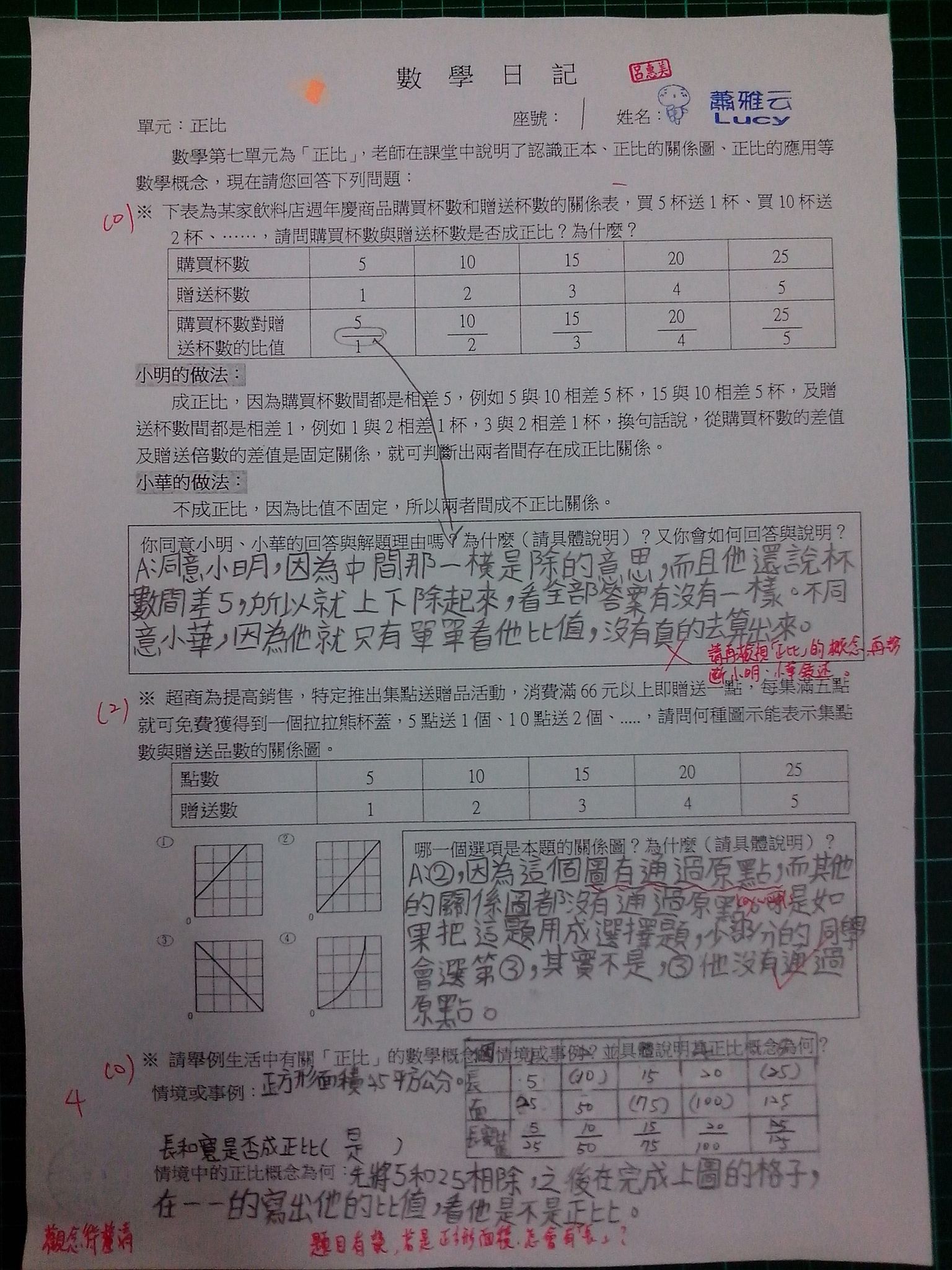 為瞭解學生數學概念及檢視其迷思概念,特設計數學日記,透過文字敘述、解題批判、及概念辯證以提升學生數學學習能力,以下為學生數學日記的作品(正比):