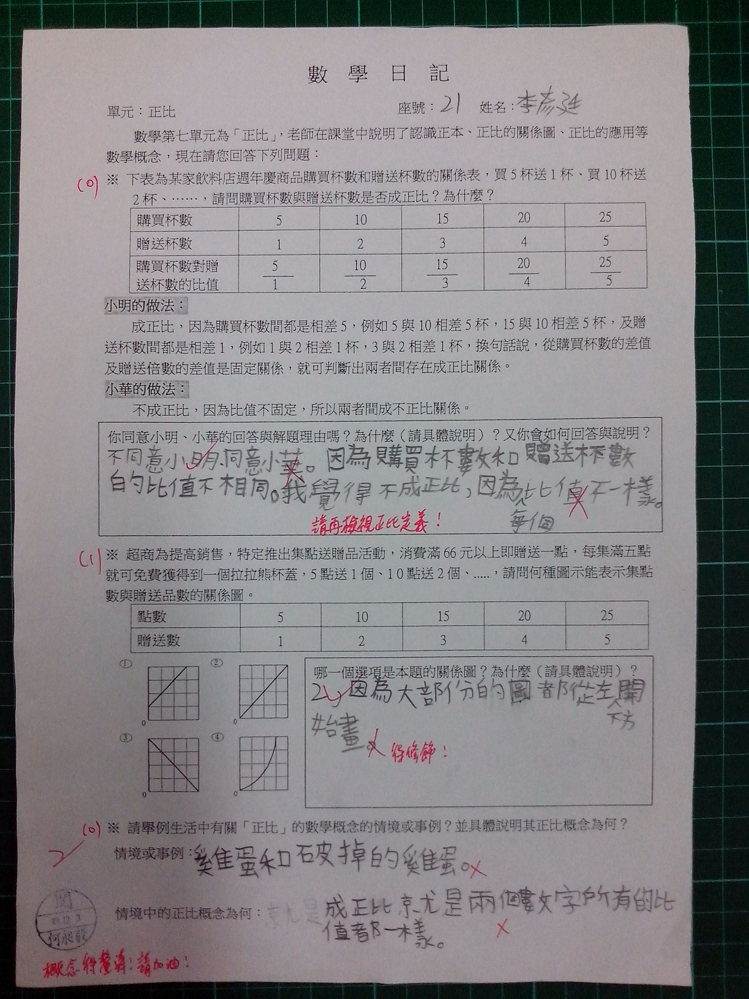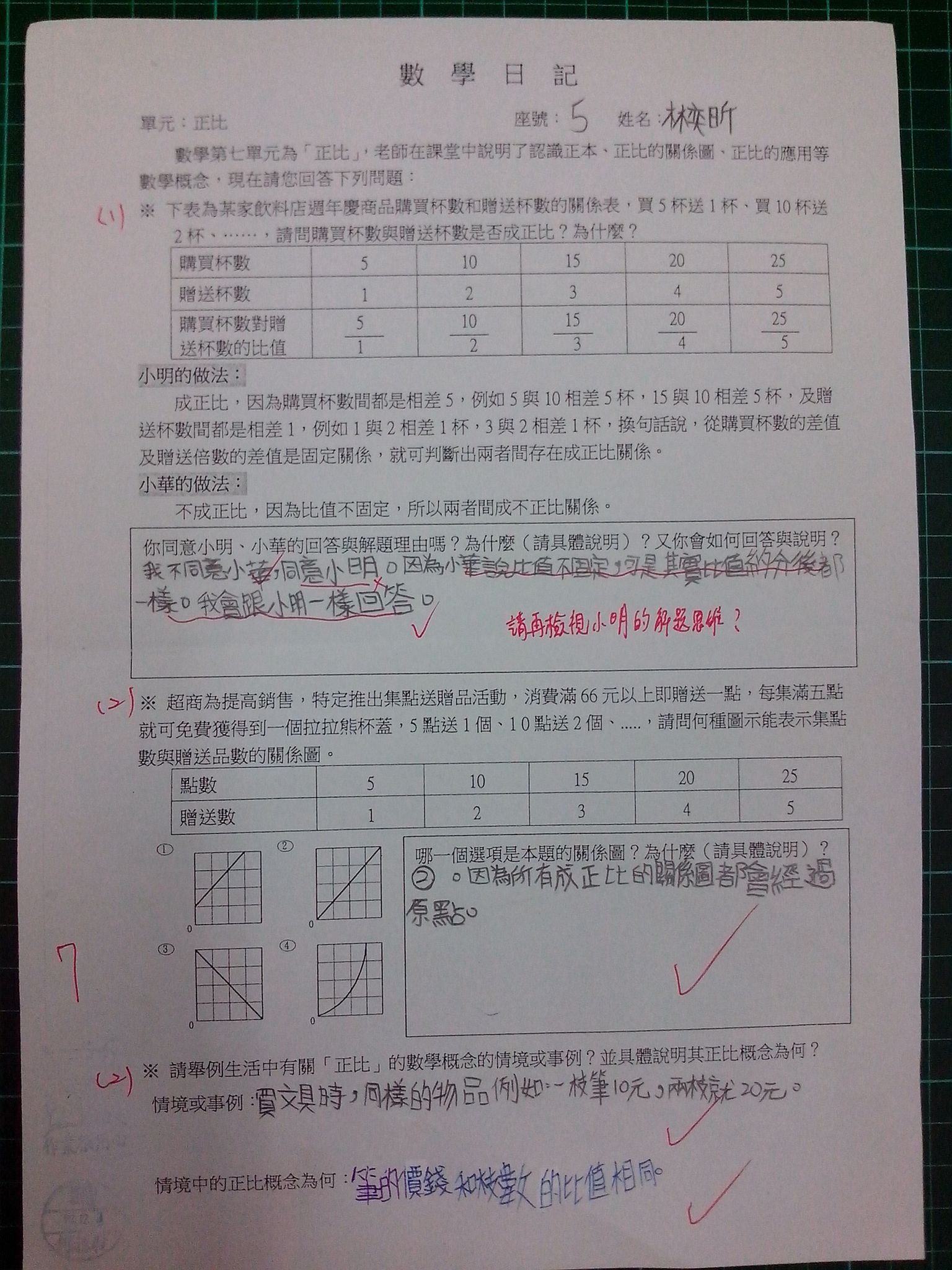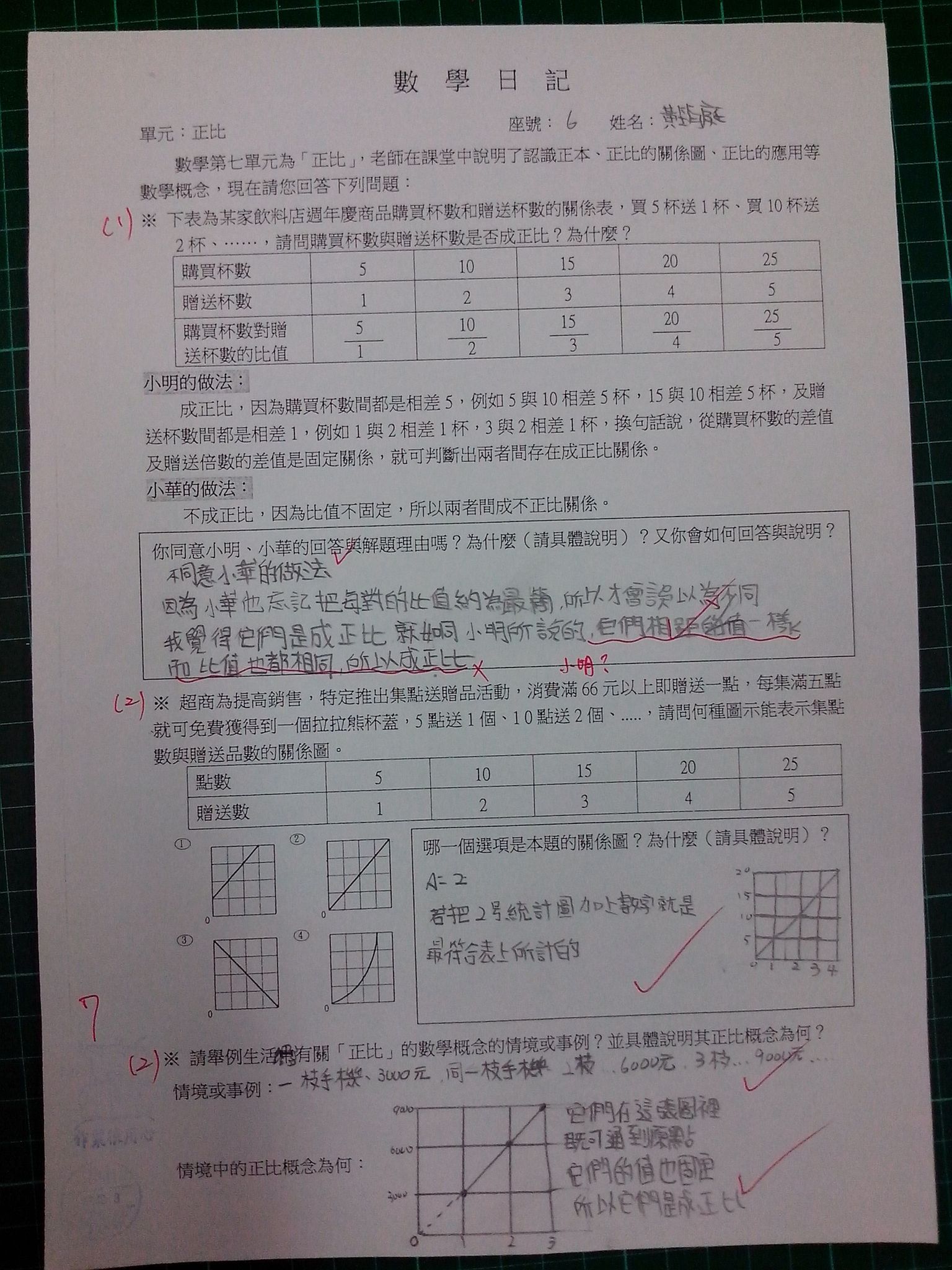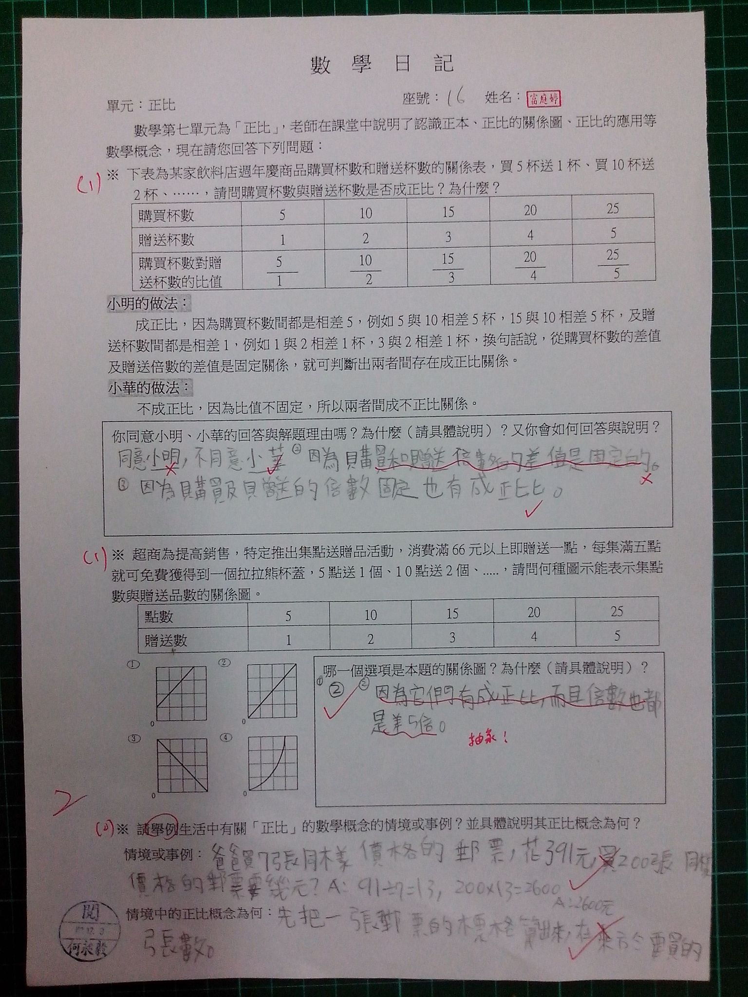 為瞭解學生數學概念及檢視其迷思概念,特設計數學日記,透過文字敘述、解題批判、及概念辯證以提升學生數學學習能力,以下為學生數學日記的作品(正比):