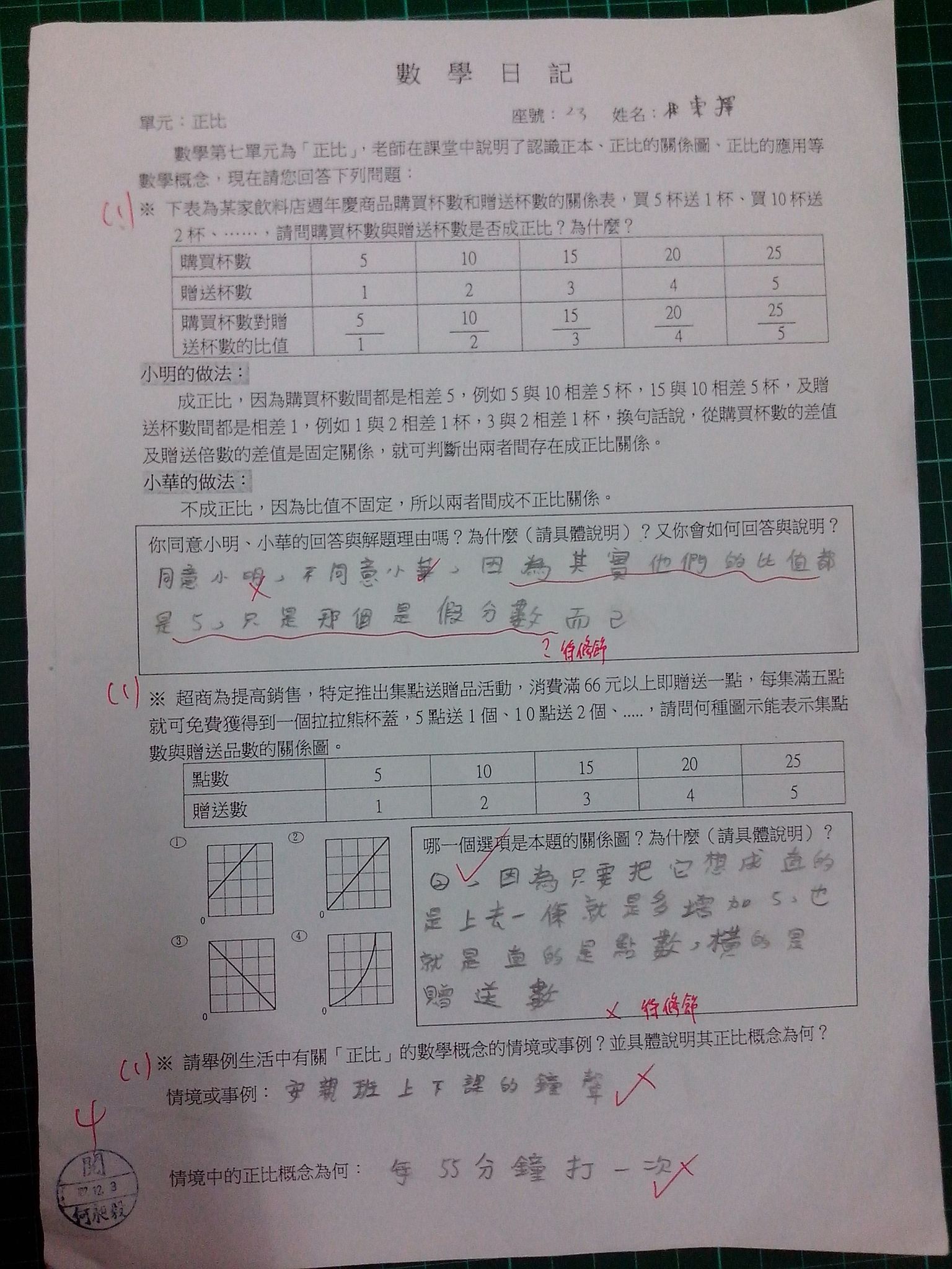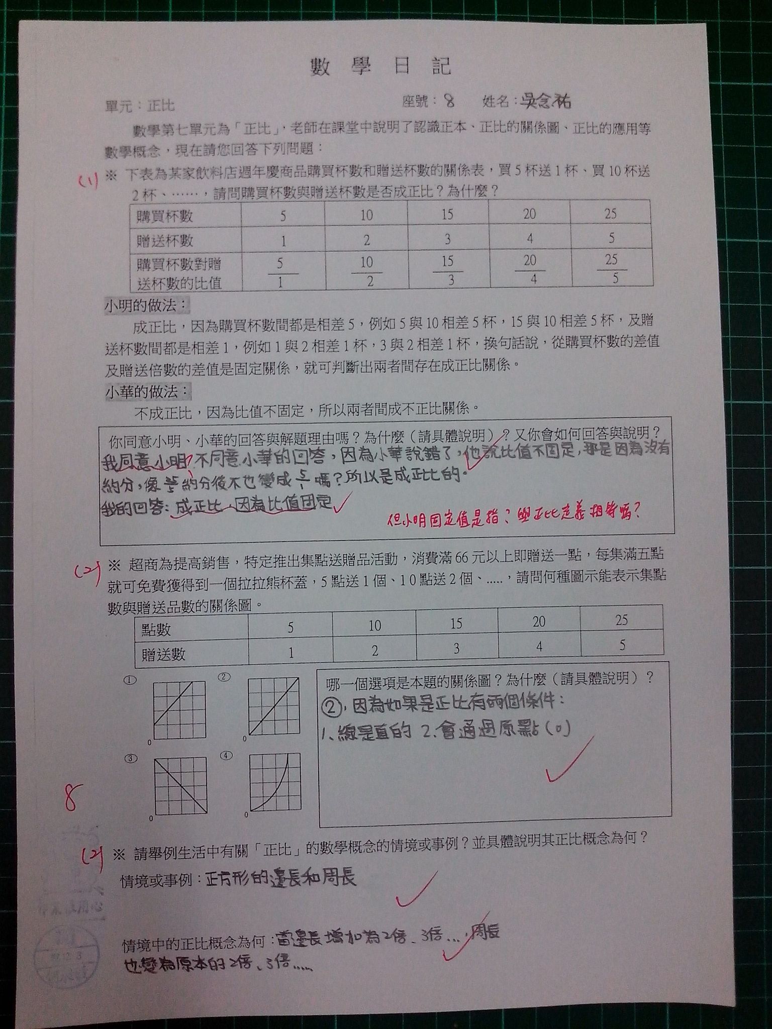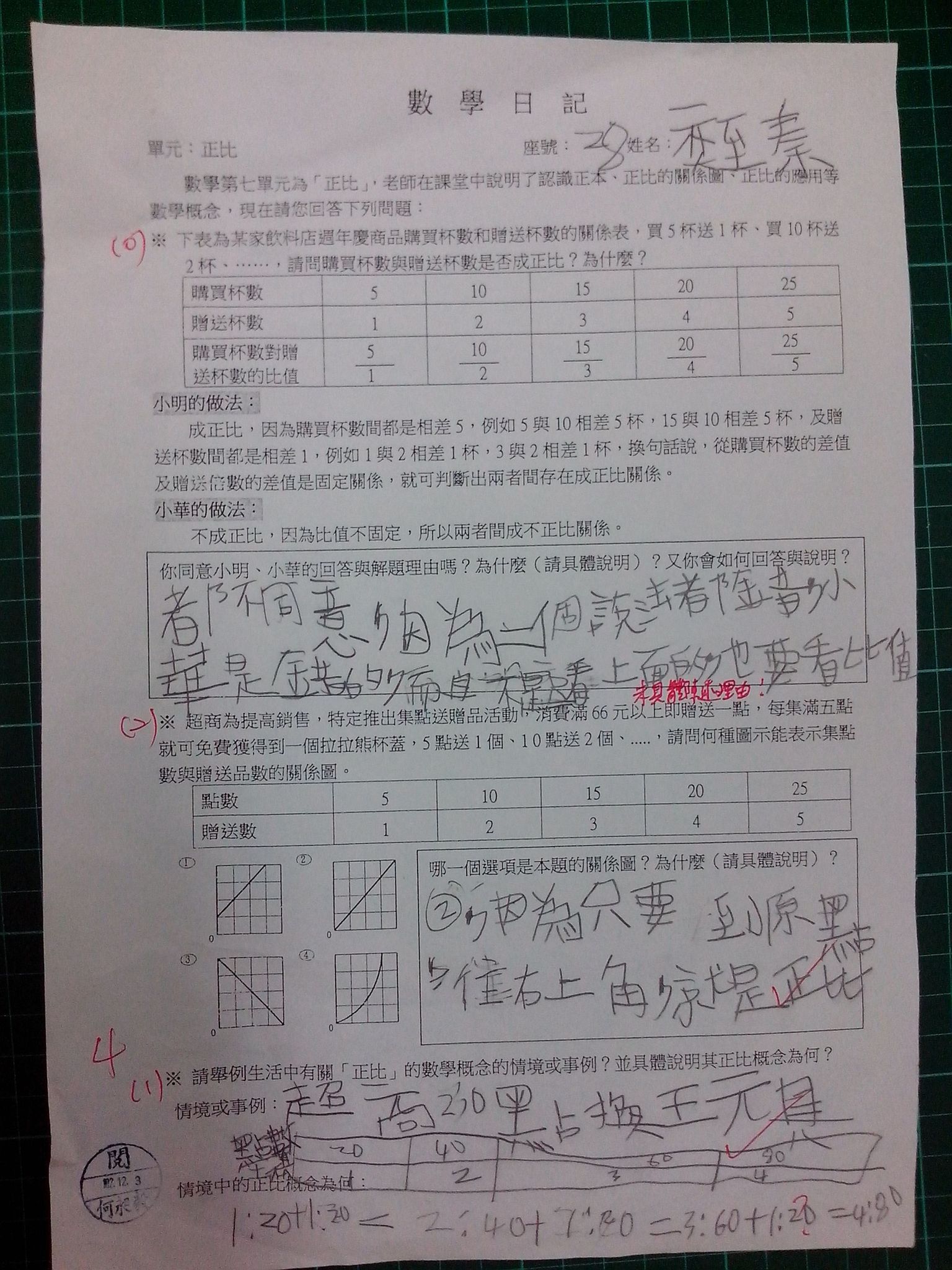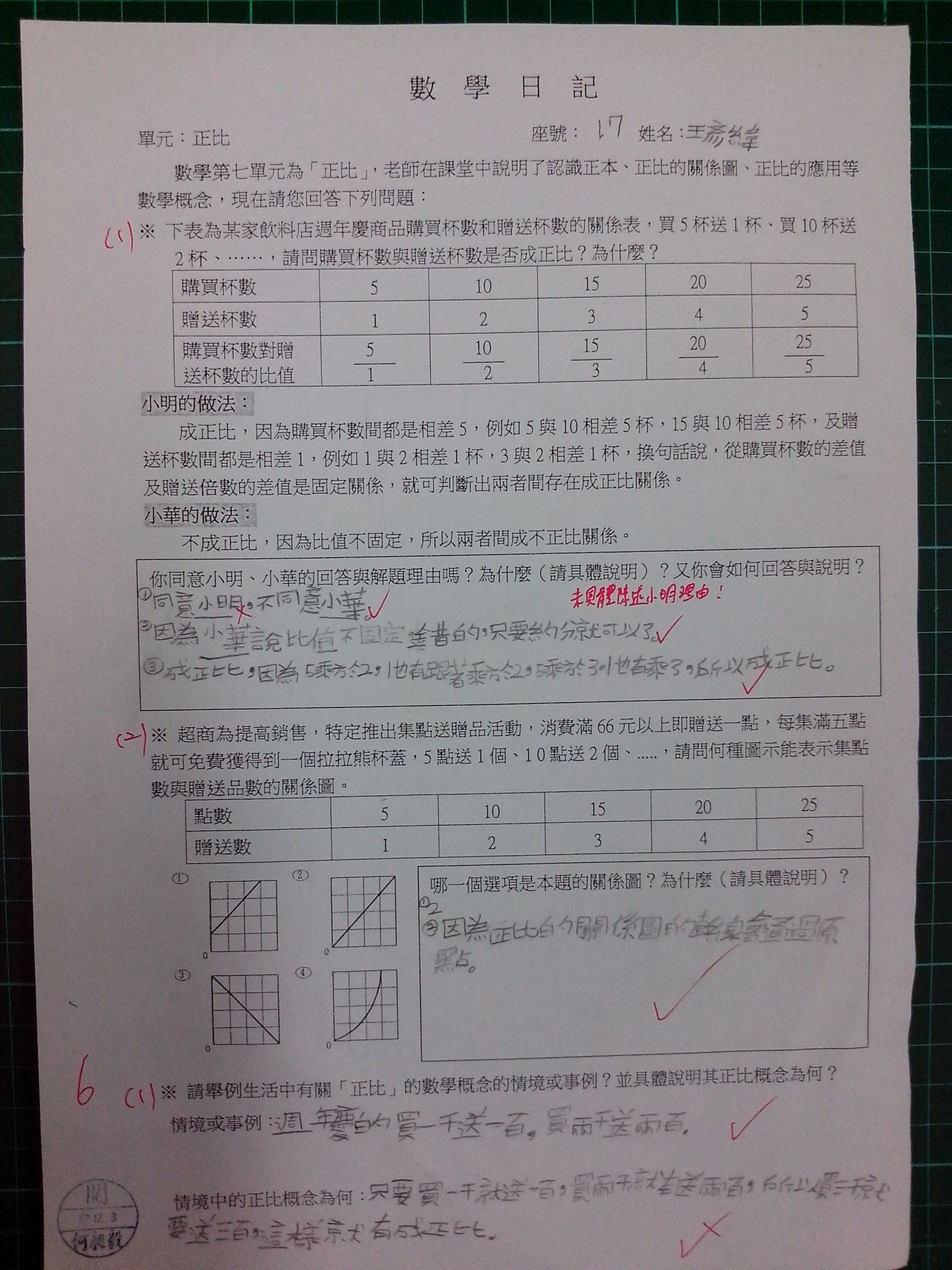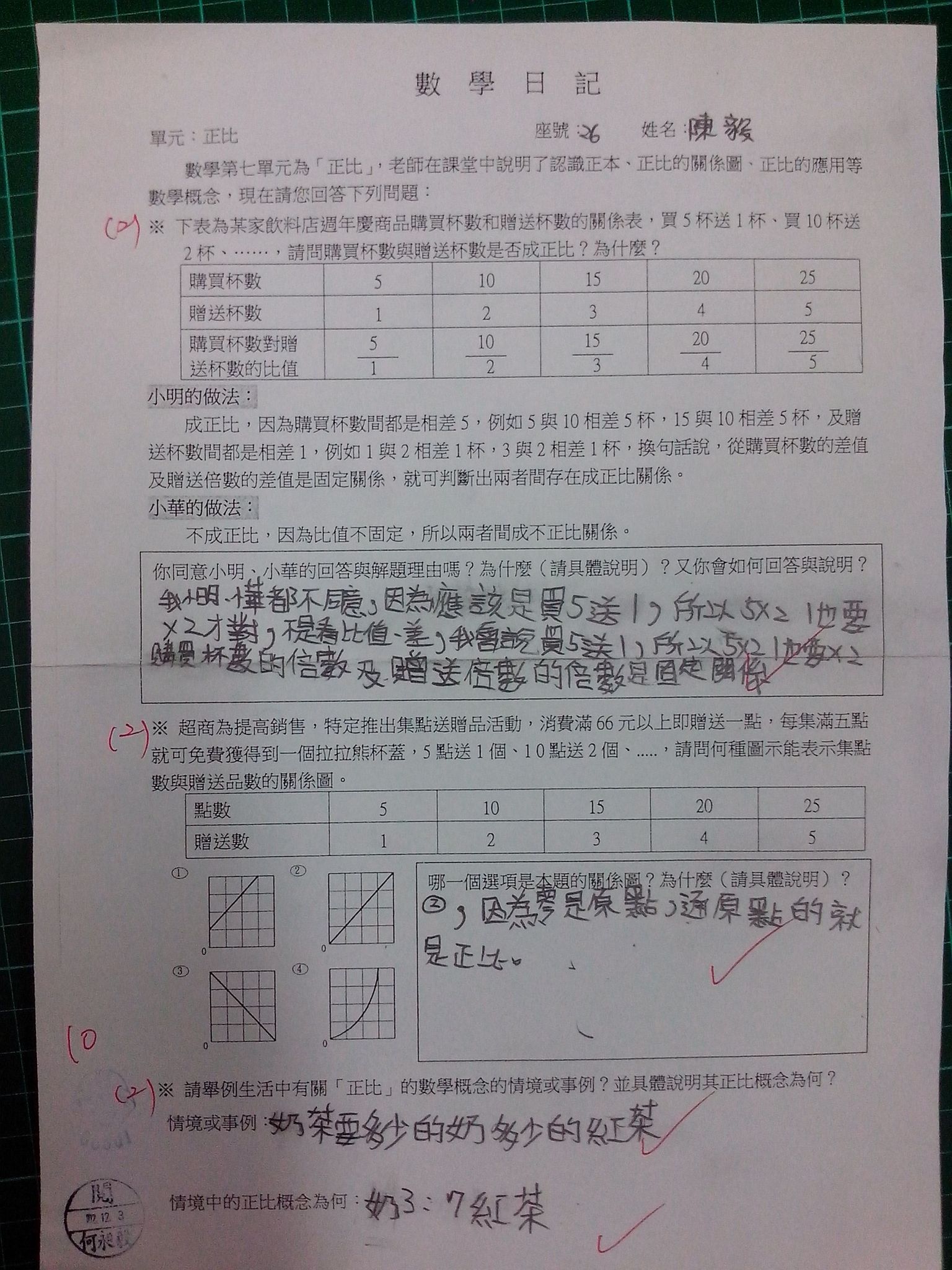 為瞭解學生數學概念及檢視其迷思概念,特設計數學日記,透過文字敘述、解題批判、及概念辯證以提升學生數學學習能力,以下為學生數學日記的作品(正比):