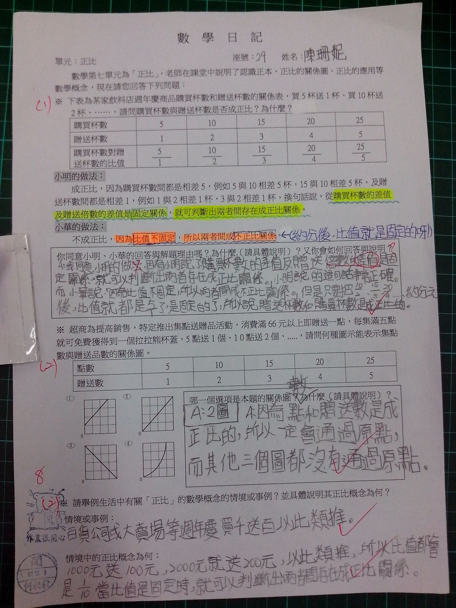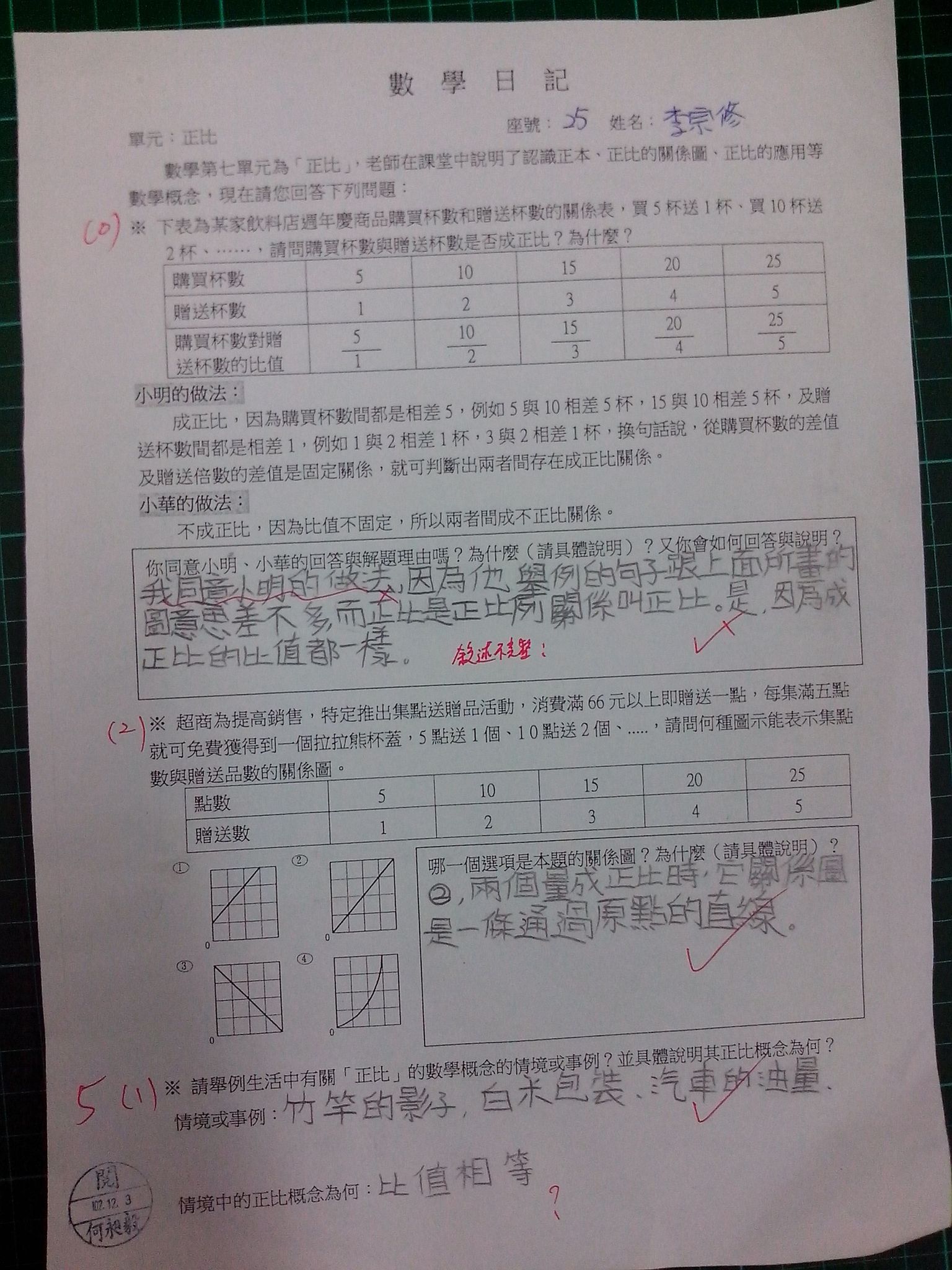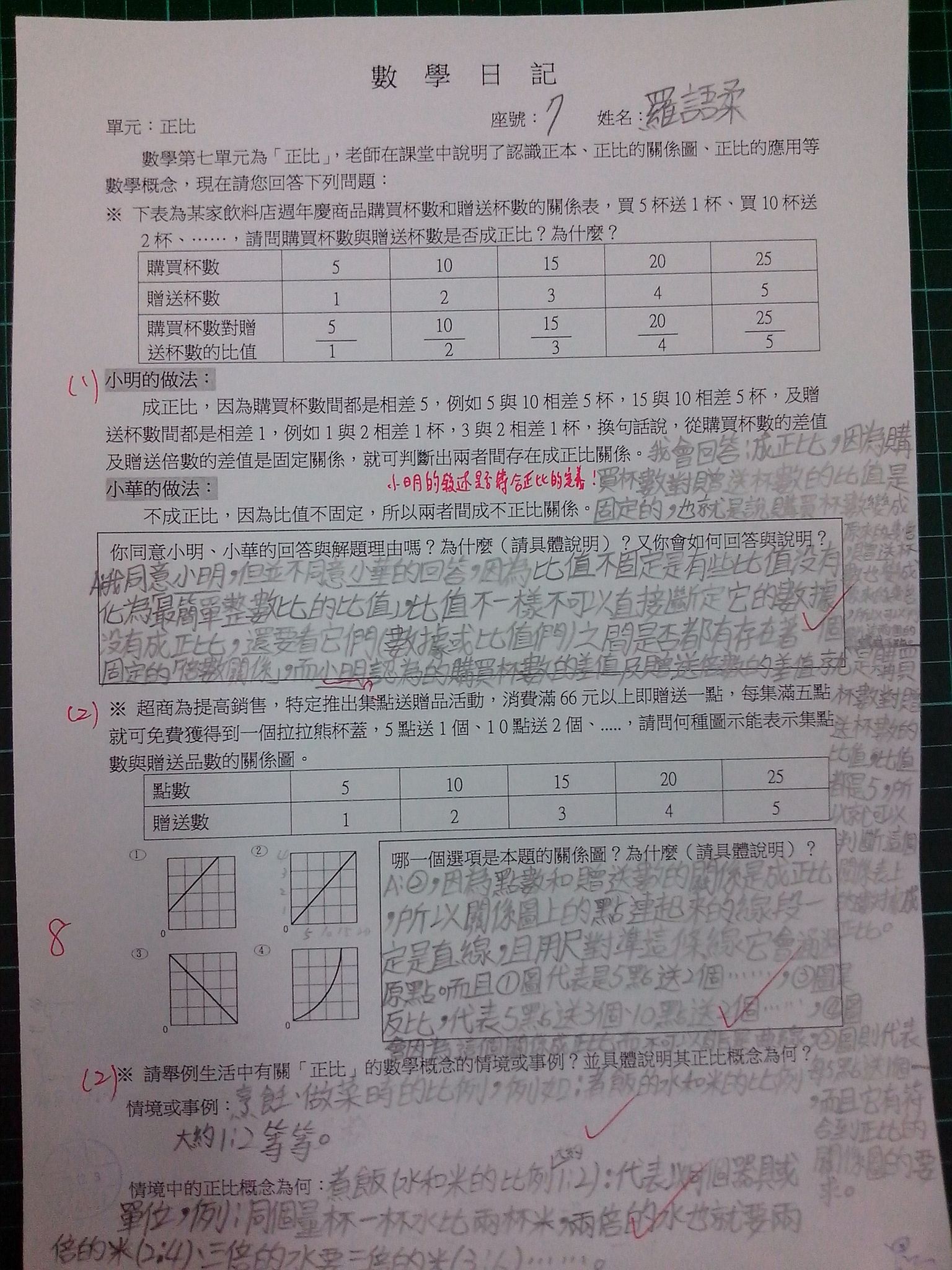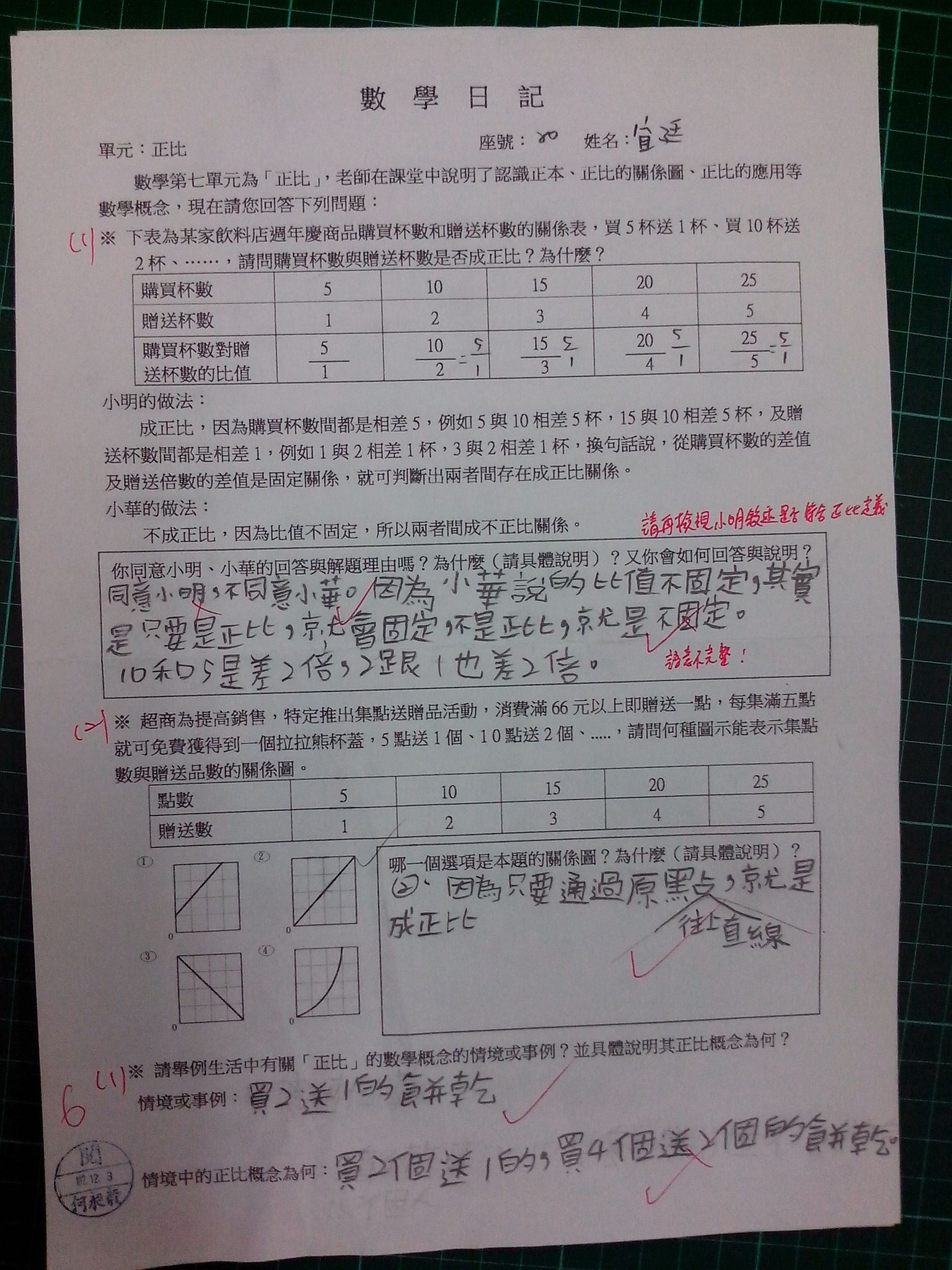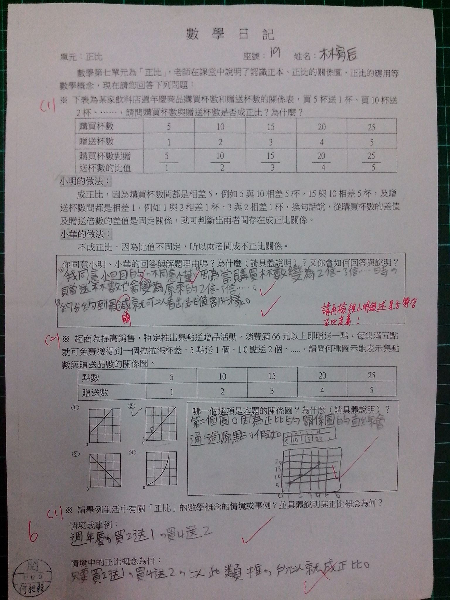 為瞭解學生數學概念及檢視其迷思概念,特設計數學日記,透過文字敘述、解題批判、及概念辯證以提升學生數學學習能力,以下為學生數學日記的作品(正比):