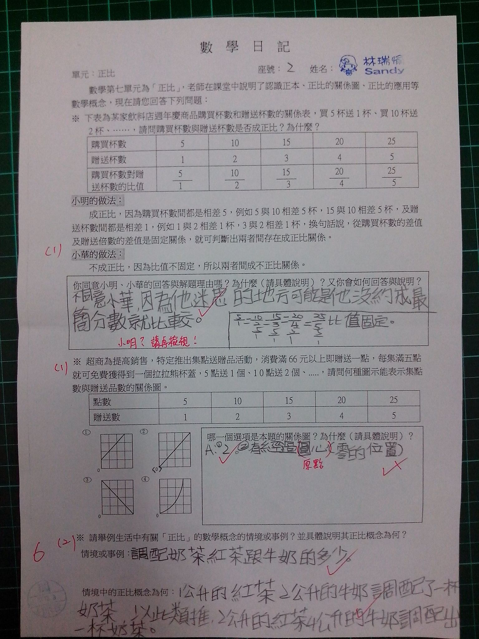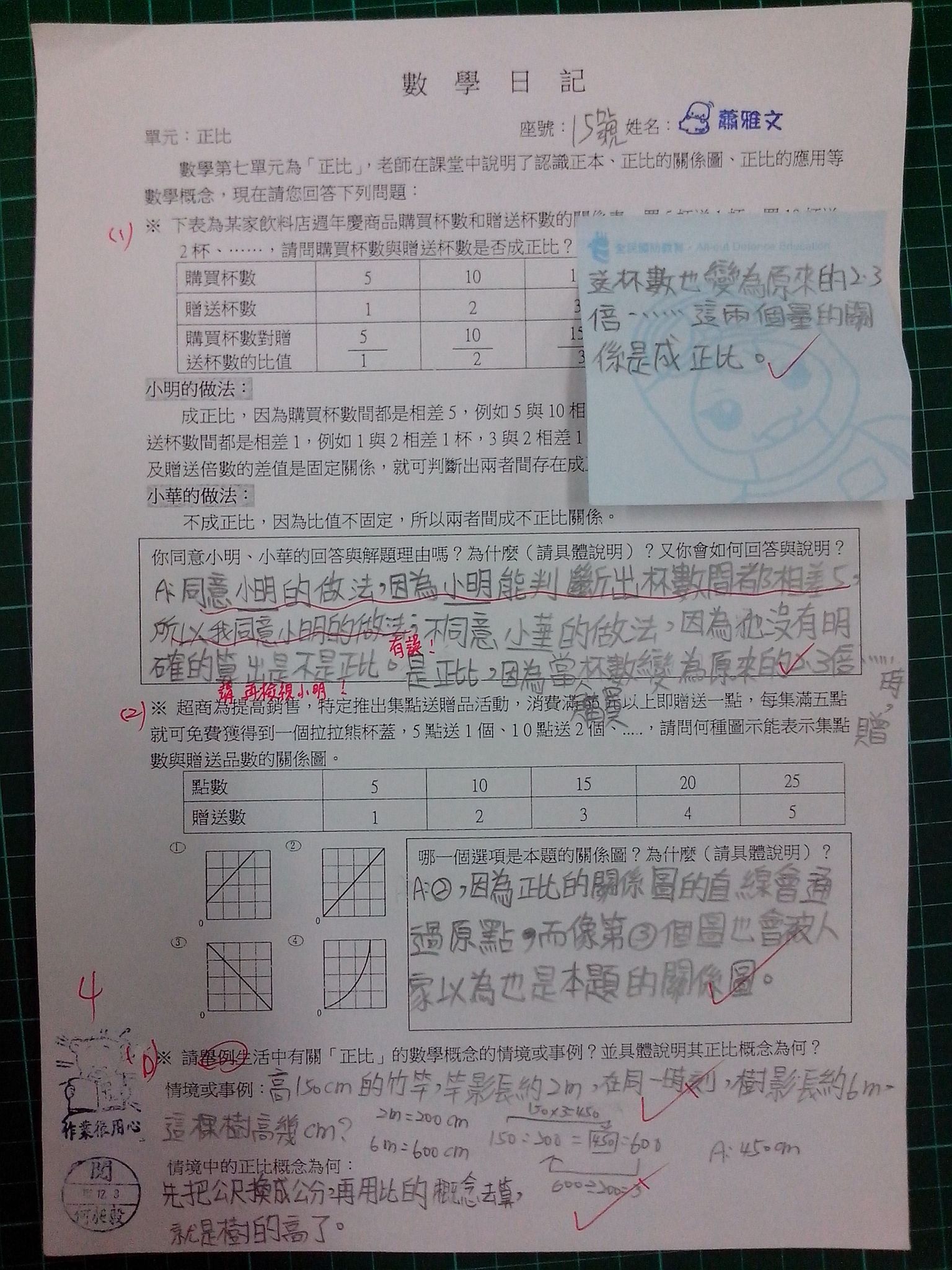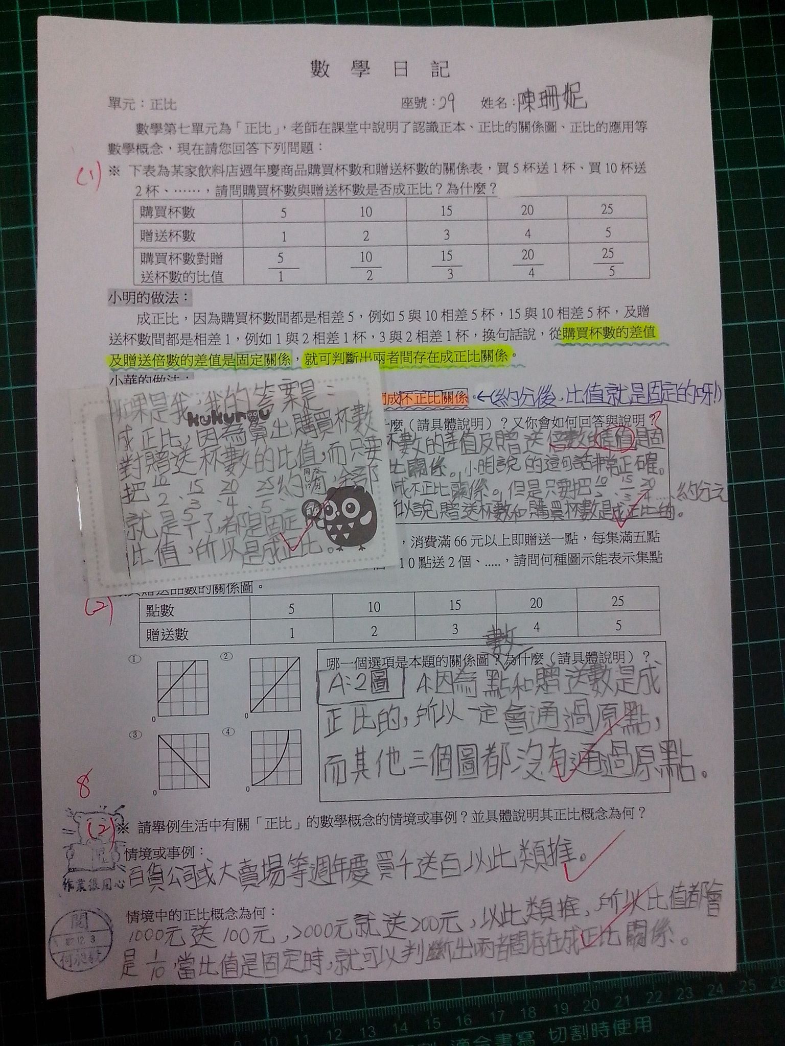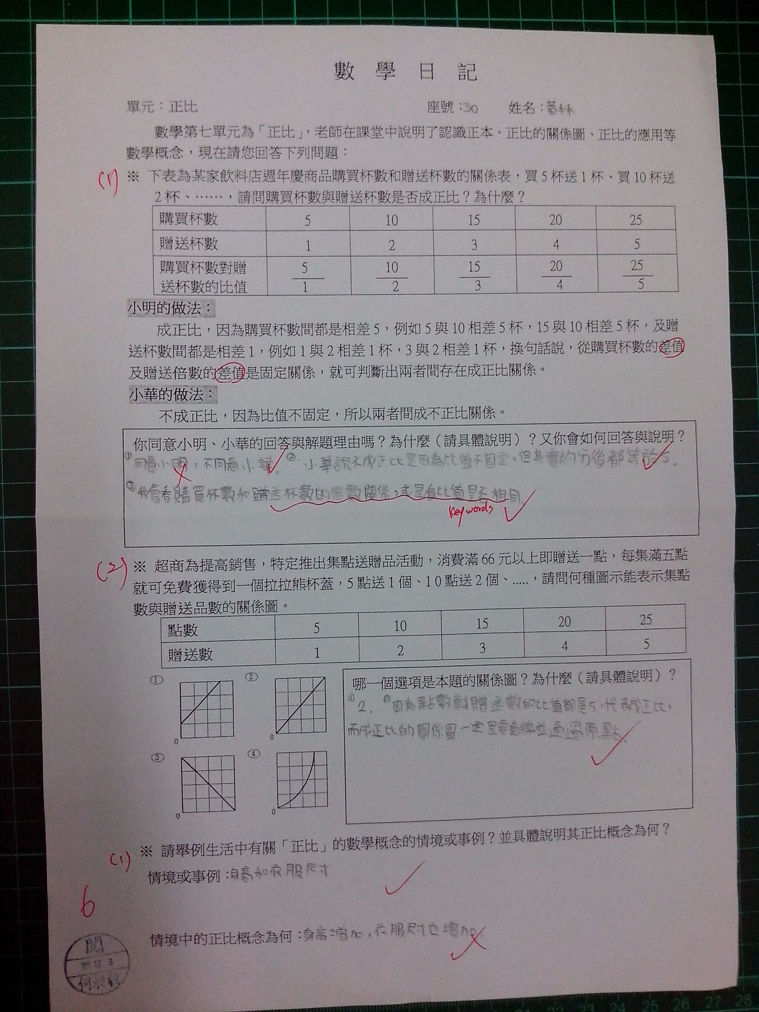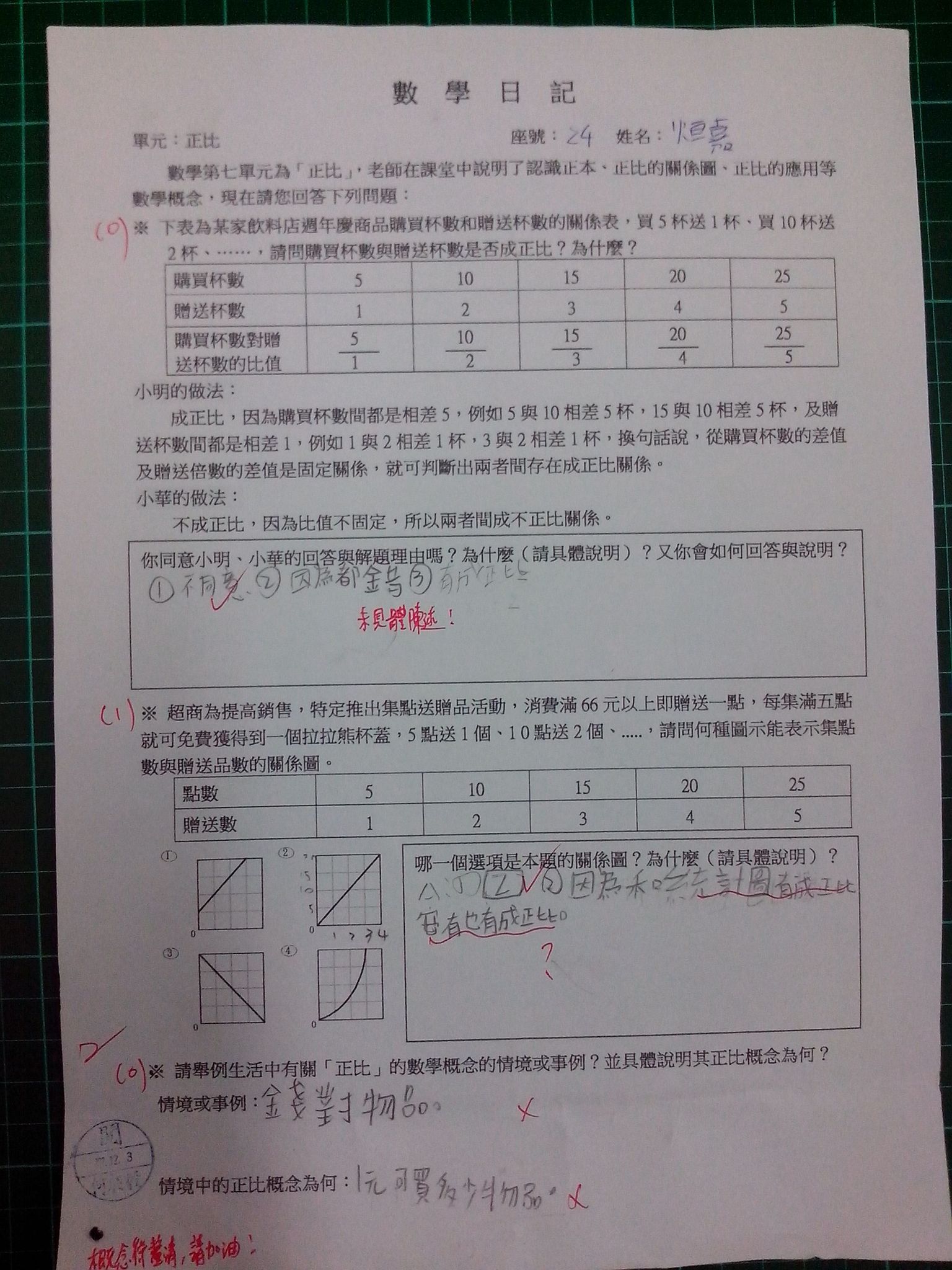 為瞭解學生數學概念及檢視其迷思概念,特設計數學日記,透過文字敘述、解題批判、及概念辯證以提升學生數學學習能力,以下為學生數學日記的作品(正比):