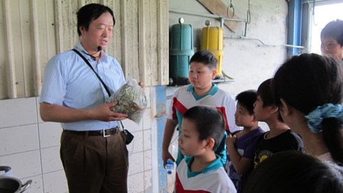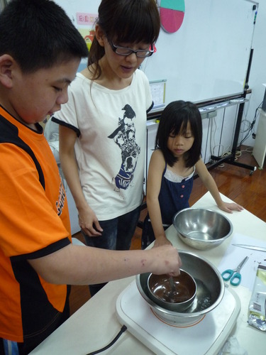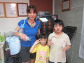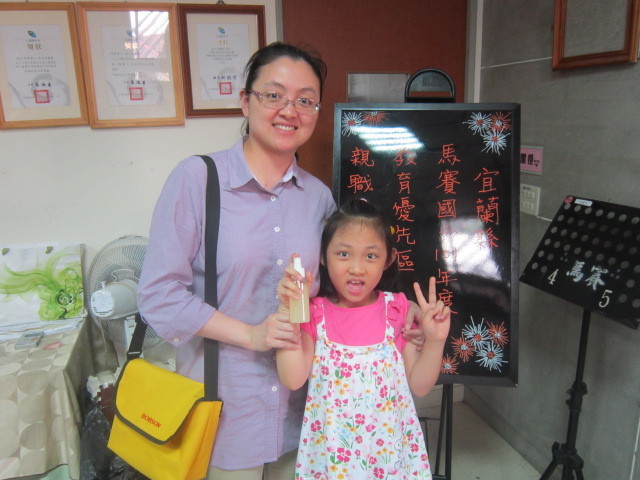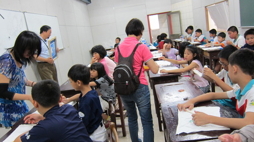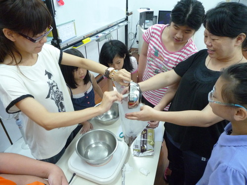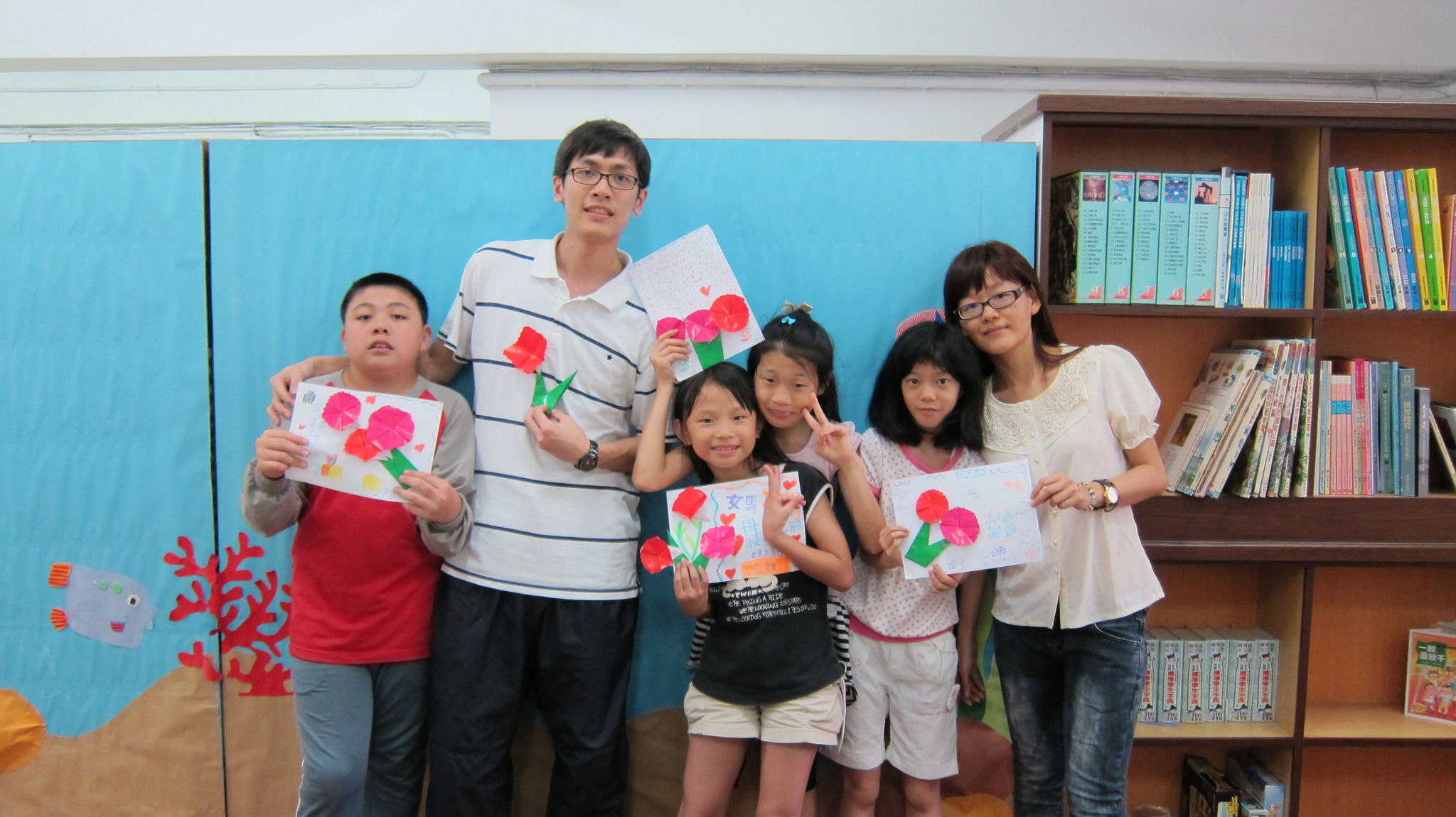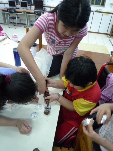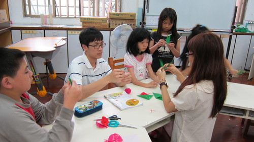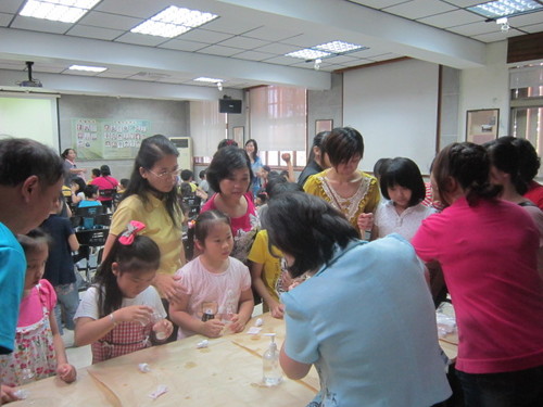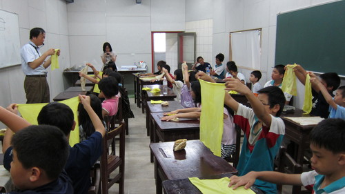 主任和愛心媽媽協助發下今天使用的工具:橡皮筋、布、竹筷