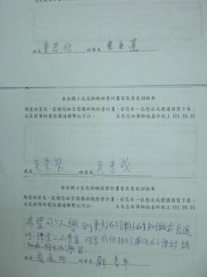101金岳國小家長意見回覆5忠作者:徐嘉珍2012 年 12 月 13 日2021 年 3 月 18 日宜蘭縣金岳國小101學年度上學期五年忠班家長意見回覆班親會通知單回條給家長的一封信回條班級經營計畫回條學校行事通知單回條