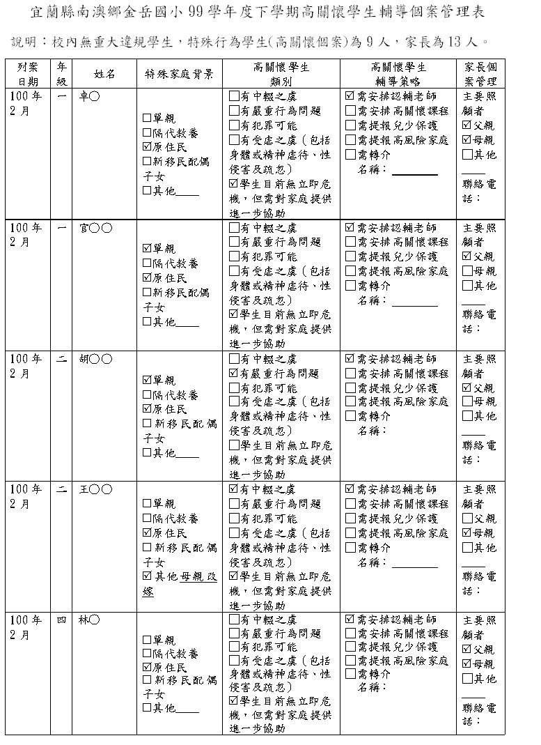 宜蘭縣金岳國民小學高關懷學生評估指標及安置輔導建議表