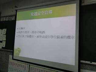 交通安全融入法治教育課程活動,主要用影片來讓學生知道飆車的嚴重性,並用動畫的演出就不致於血腥。再來讓學生明瞭今年交通部重要的乘車政策—安全座椅、後座繫安全帶。