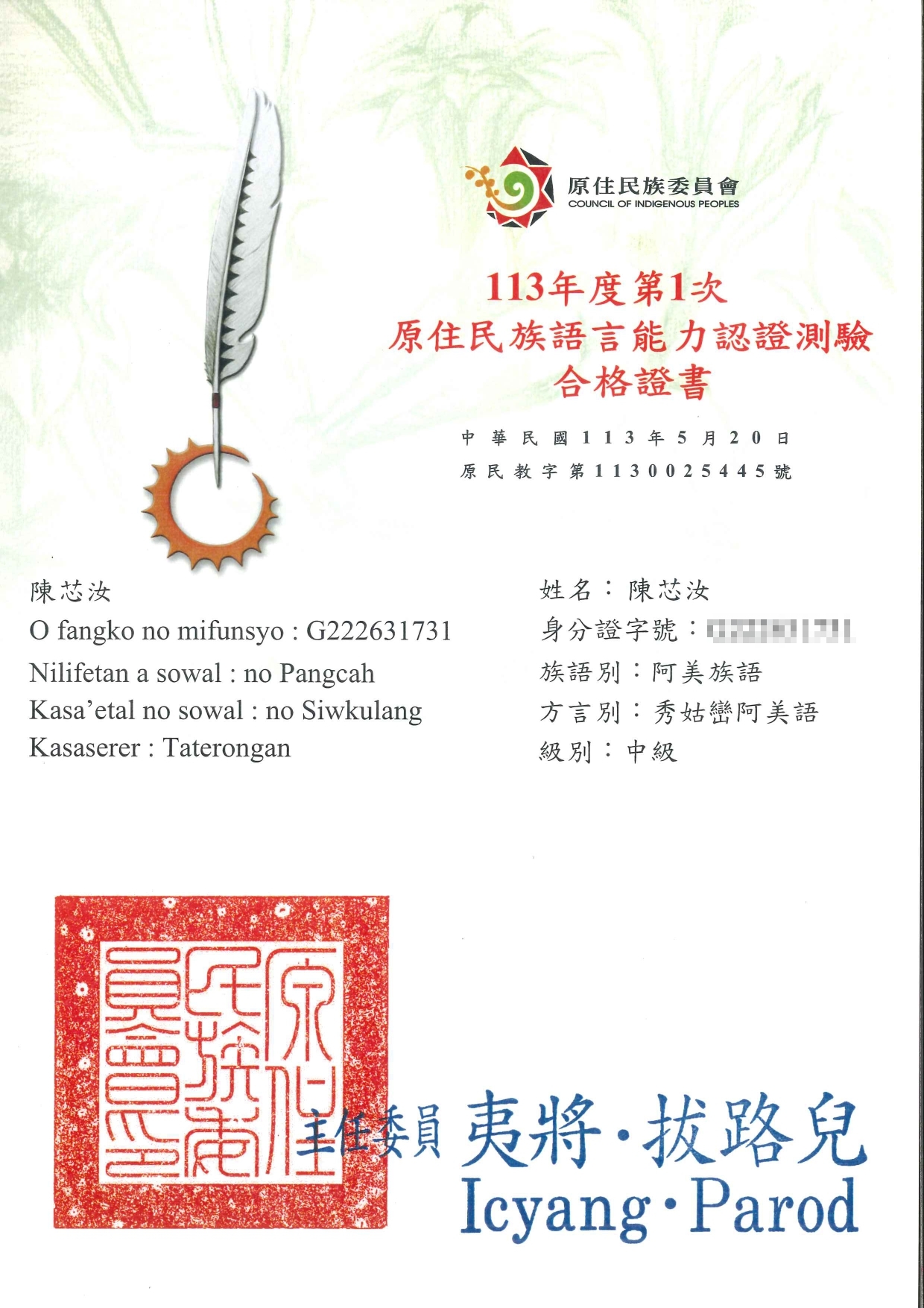 恭賀本校六年仁班學生陳芯汝、六年忠班學生秦子甯通過113年度第1次原住民族語言認證-海岸阿美語中級!!!!