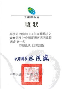 本校 蔡秋菊組長榮獲114年宜蘭縣語文競賽  社會組臺灣客語四縣腔朗讀組 第一名!!