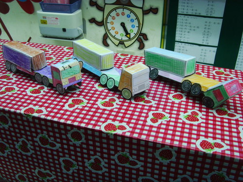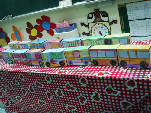 下面是小朋友們做的箱型車,老師把他接在一起想拍照,