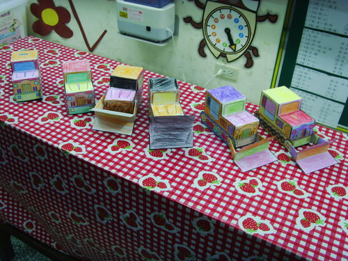 下面是小朋友們做的箱型車,老師把他接在一起想拍照,