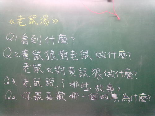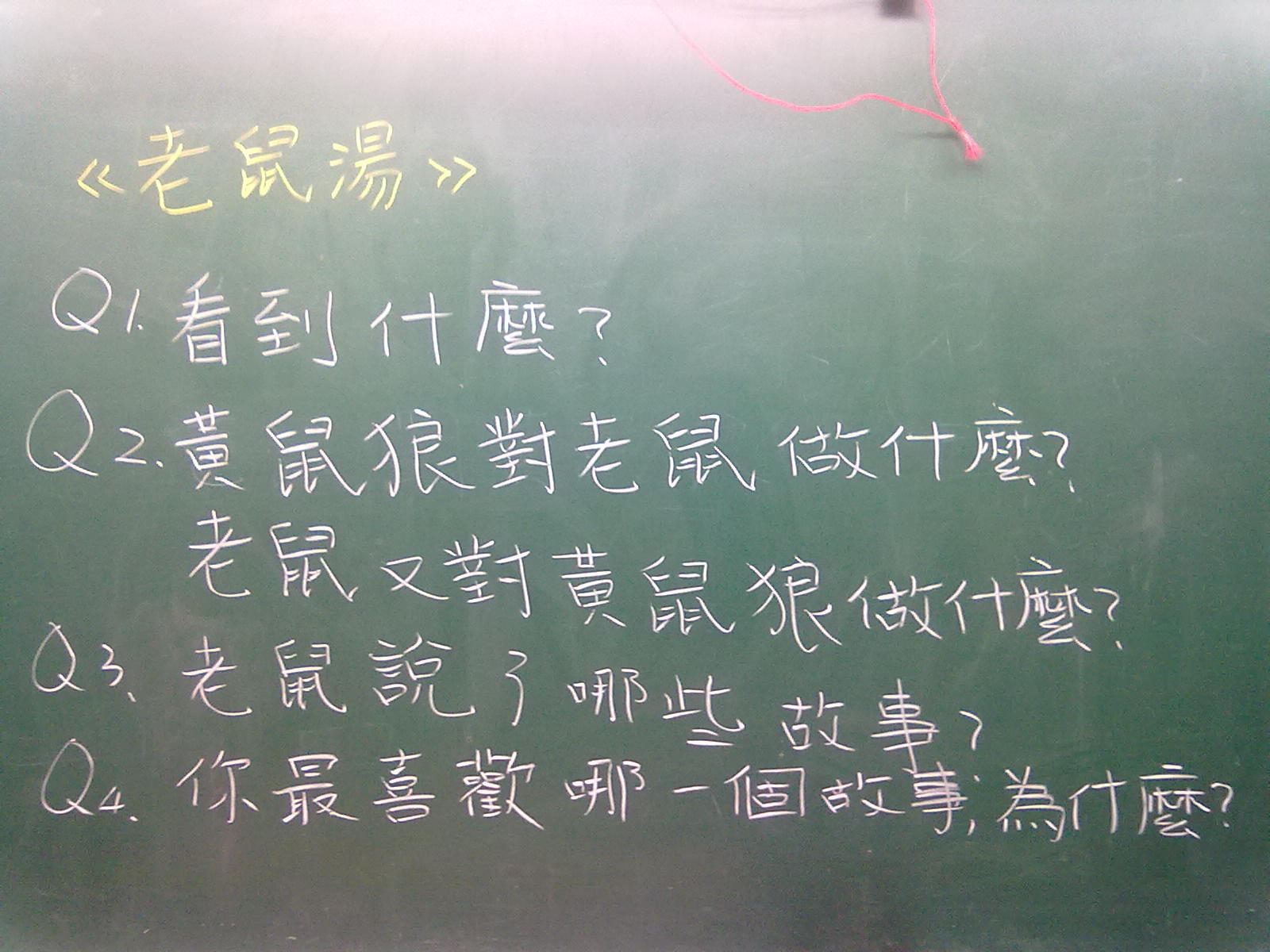 老師的問題,具有第一層次的”看到什麼?”與第二層次”黃鼠狼對老鼠做什麼?老鼠對黃鼠狼做什麼?”…也包含了第三層次感覺性的問題”以及”喜歡哪一個故事,為什麼?”