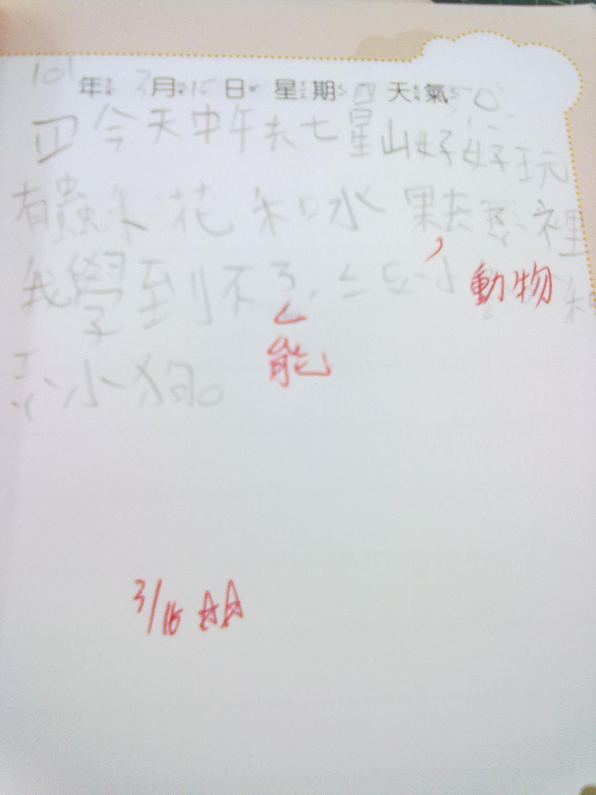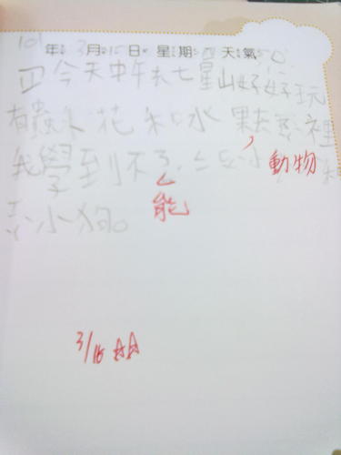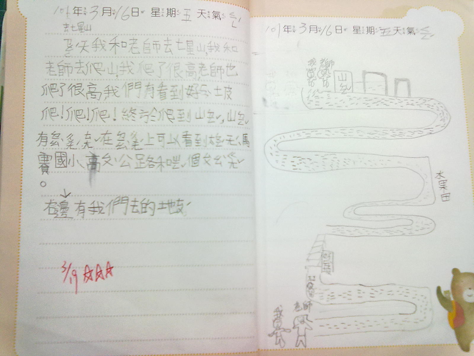 他寫到:昨天我和老師去七星山,我和老師去爬山,我爬了很高,老師也爬了很高,我們有看到好漢坡,爬!爬!爬!終於爬到山頂,山頂有吊床,躺在吊床上可以看到太平洋,馬賽國小,高速公路和整個蘇澳港.