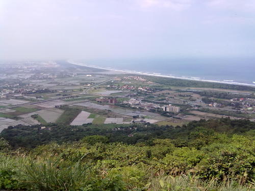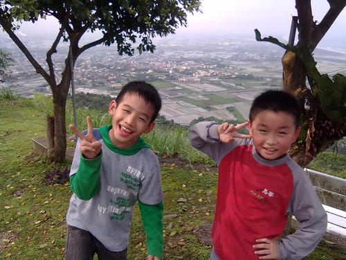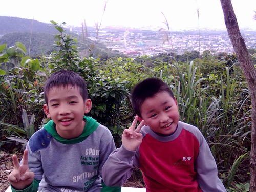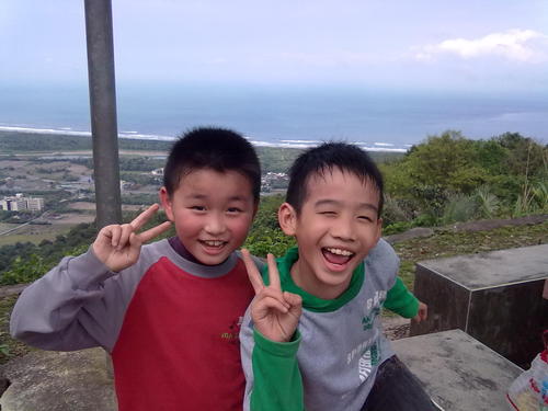 第十四個步驟:到七星嶺山頂處,讓他們看看海(小毓提到海浪好像一面牆???不太懂,但他們望著太平洋…..紅著臉兒,剎是辛勤之後獲得如此美景),再問一個深刻的問題”馬賽國小在哪裡?指出學校歡顏館的位置?)發現孩子的視覺能力也很好,可以尋著佳蓉老師的手指方向,看到灰色圓餅的歡顏館喔!