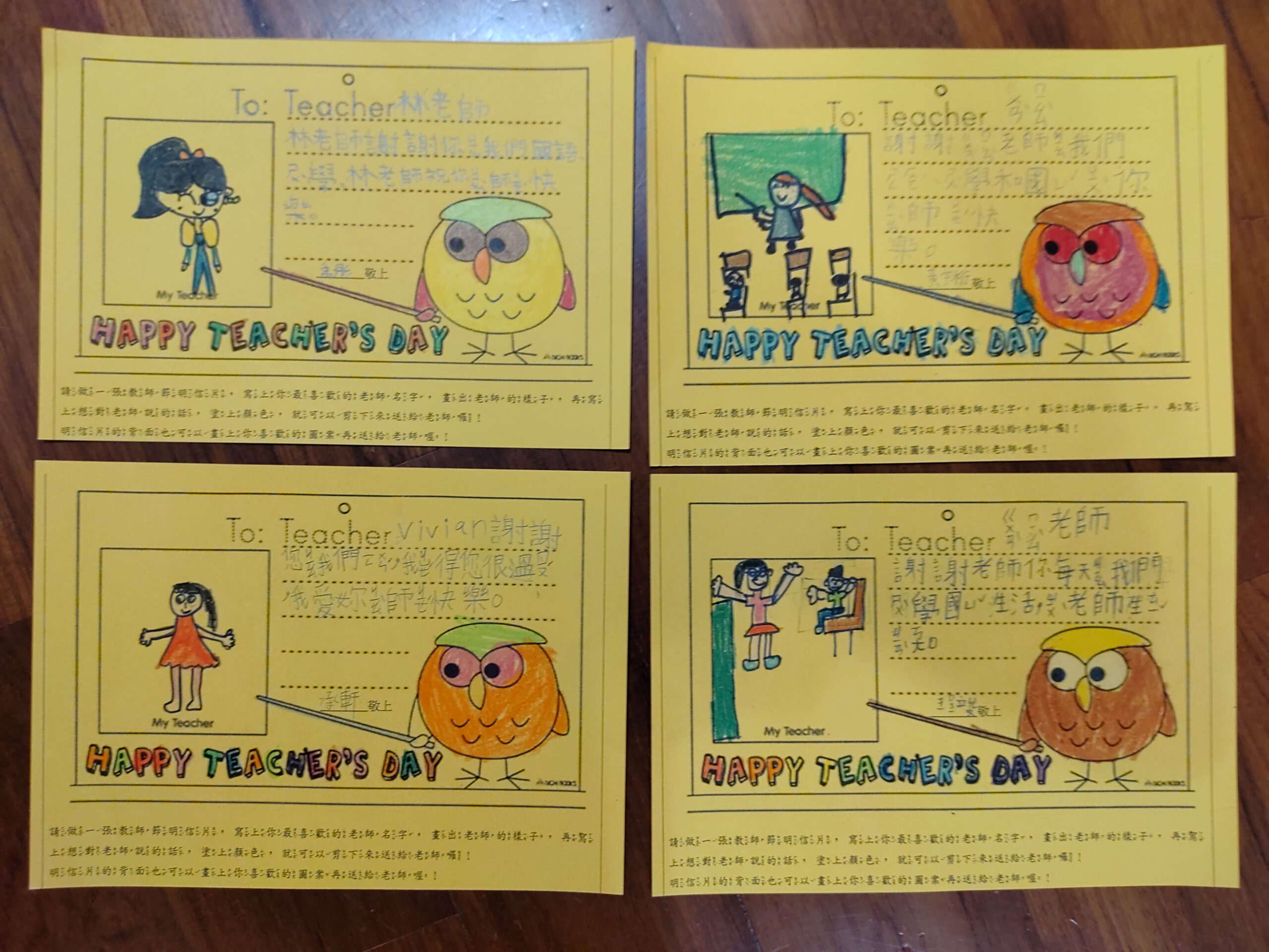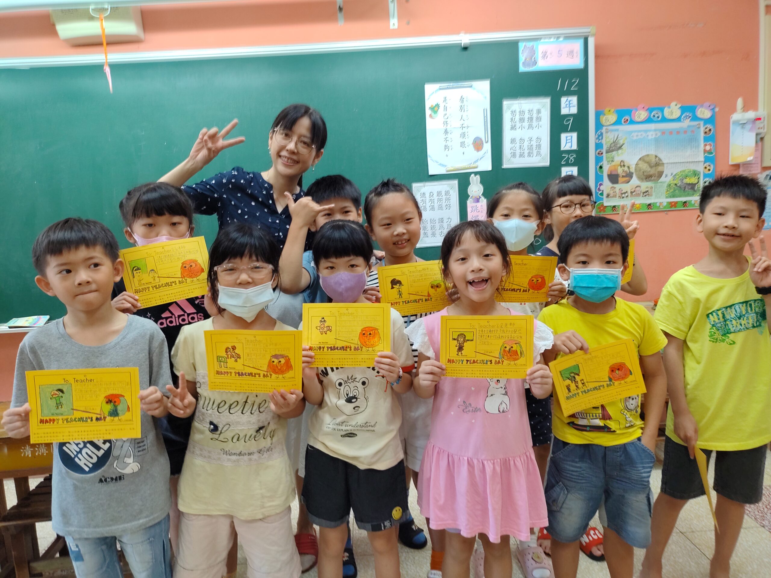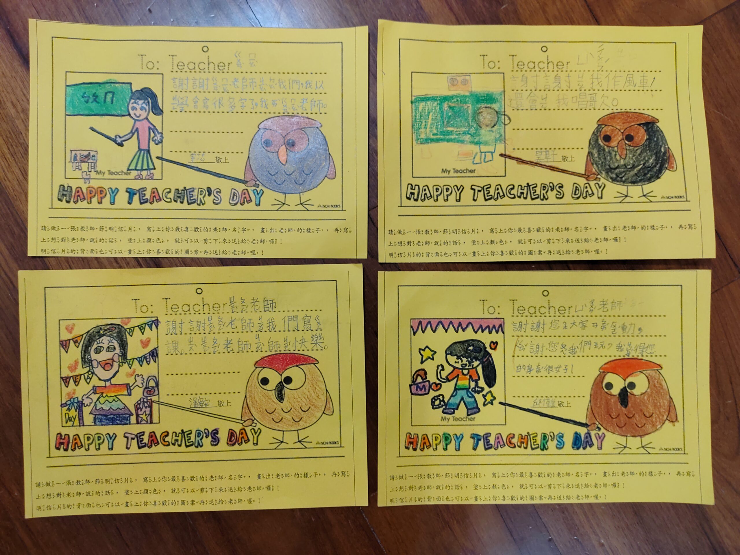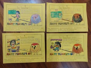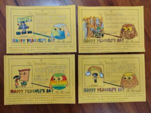教師節快樂!!2023 年 9 月 28 日 林冠妙學校發給每一個小朋友一張明信片,讓小朋友寫下感謝的話,送給平時辛苦教導他們的老師,今天小朋友將用心製作的明信片送給老師,每個老師都很開心、很驚喜,謝謝小朋友貼心的祝福,老師每天被你們這些可愛的孩子圍繞,感到很幸福呀!