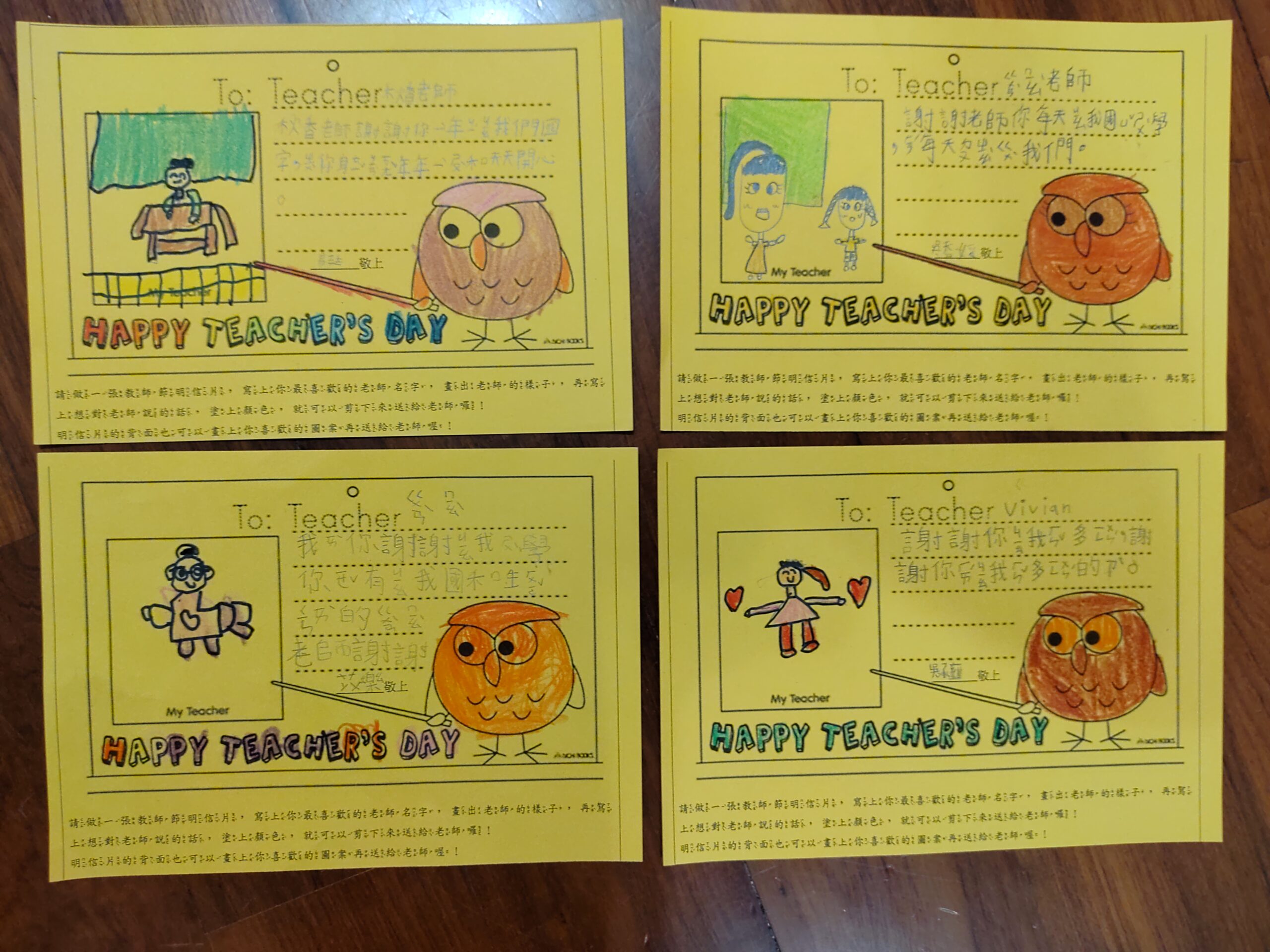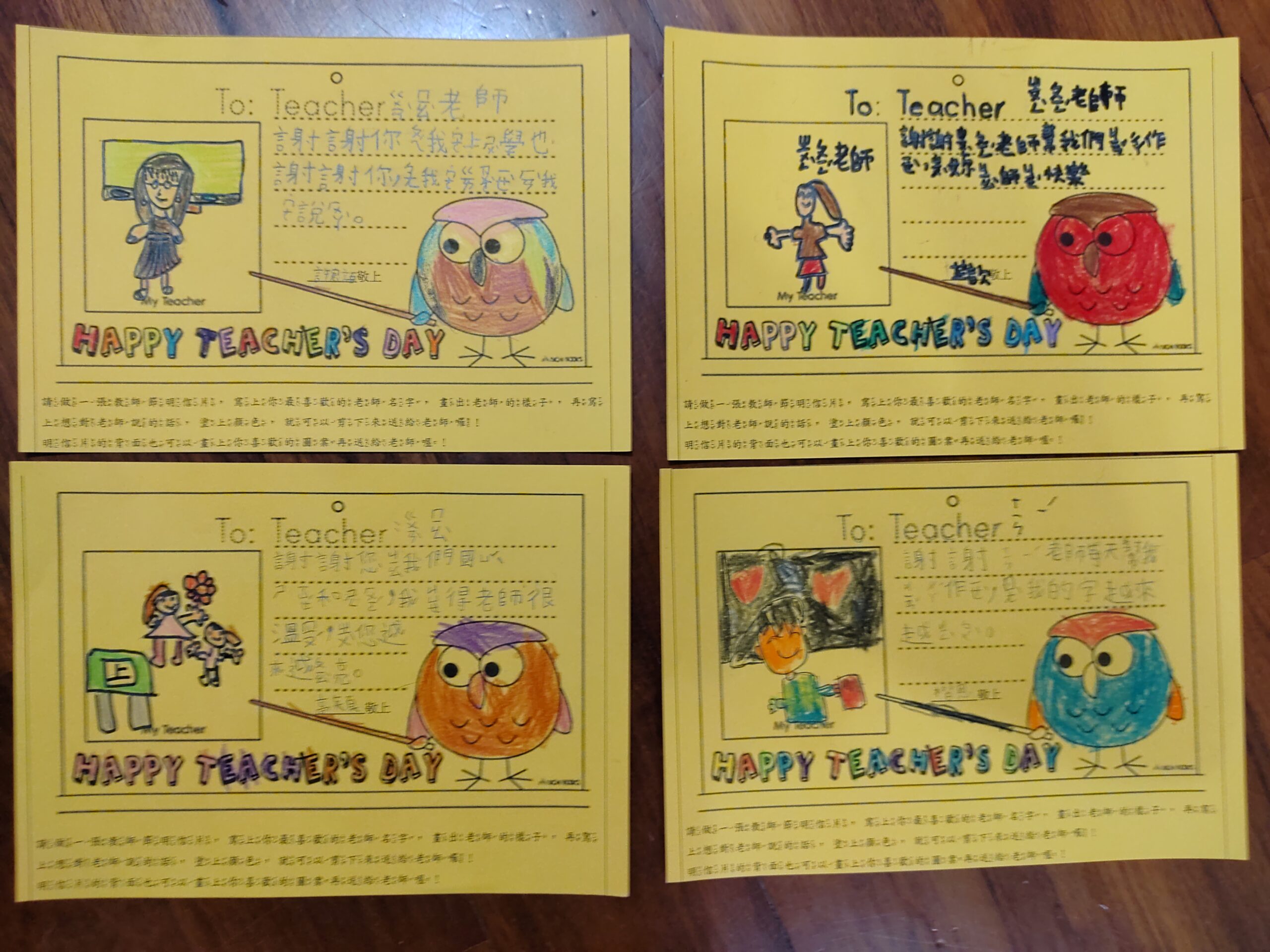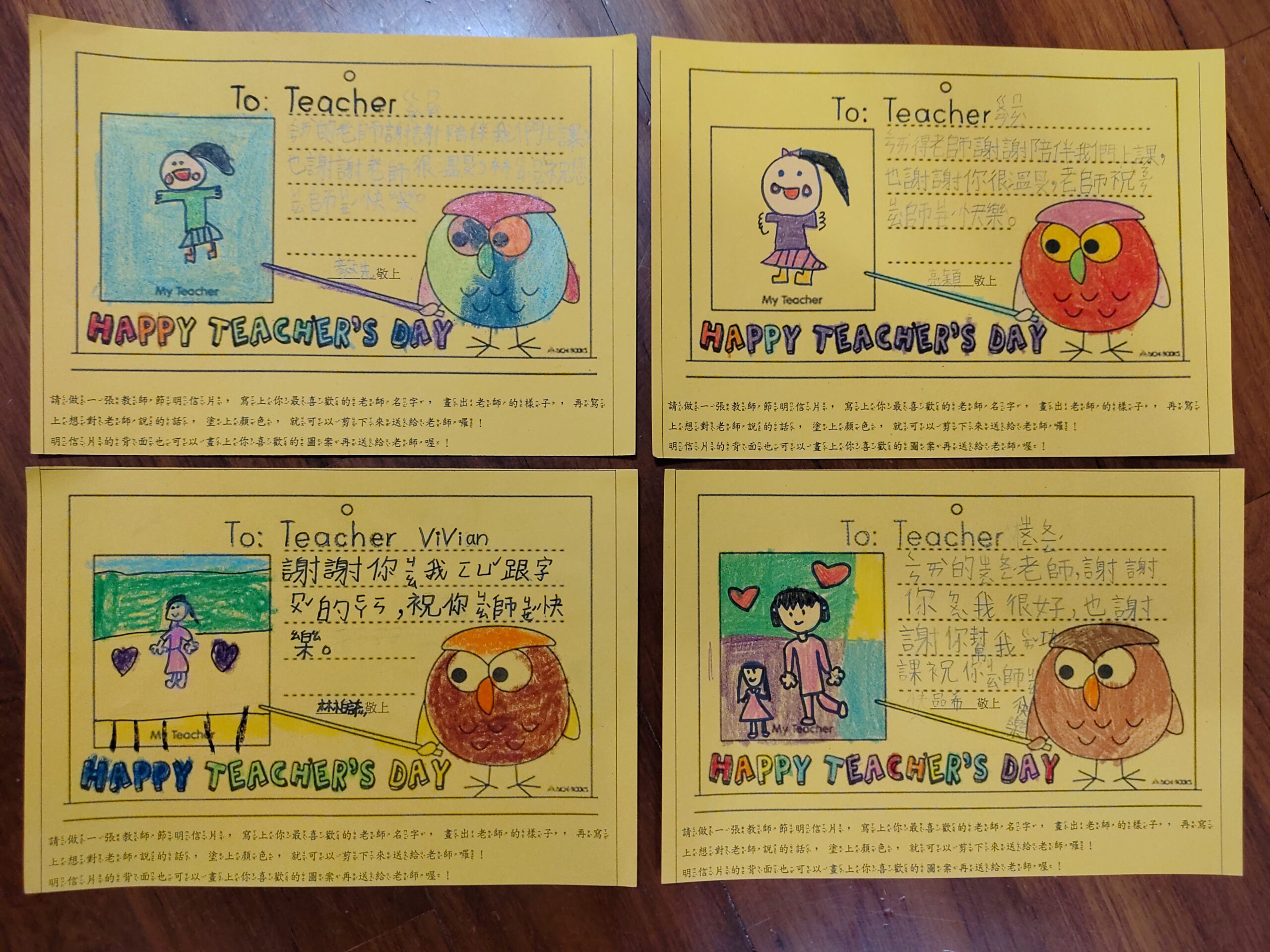 教師節快樂!!2023 年 9 月 28 日 林冠妙學校發給每一個小朋友一張明信片,讓小朋友寫下感謝的話,送給平時辛苦教導他們的老師,今天小朋友將用心製作的明信片送給老師,每個老師都很開心、很驚喜,謝謝小朋友貼心的祝福,老師每天被你們這些可愛的孩子圍繞,感到很幸福呀!