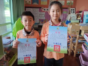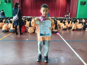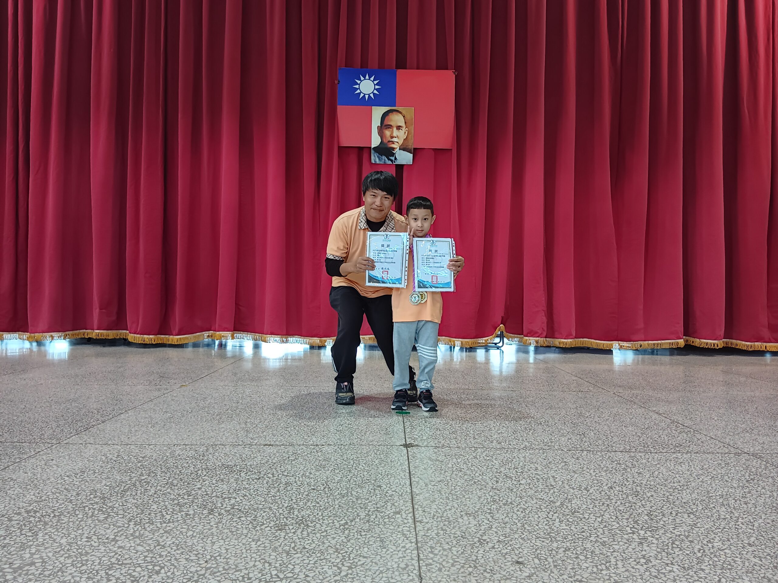第十五週學生朝會頒獎2023 年 12 月 6 日 林冠妙今天學生朝會頒發閱讀的獎項,本班的易廷和千羽得到閱讀小學士,宥安得到閱讀小碩士,恭喜獲獎同學! 柏硯上週末參加全國中正盃空手道錦標賽,得到「國小一二年級組個人形第一名」,以及「國小男子一二年級組第1量級第二名」,表現優異,學校特別再頒發一次獎牌、獎狀,恭喜柏硯!
