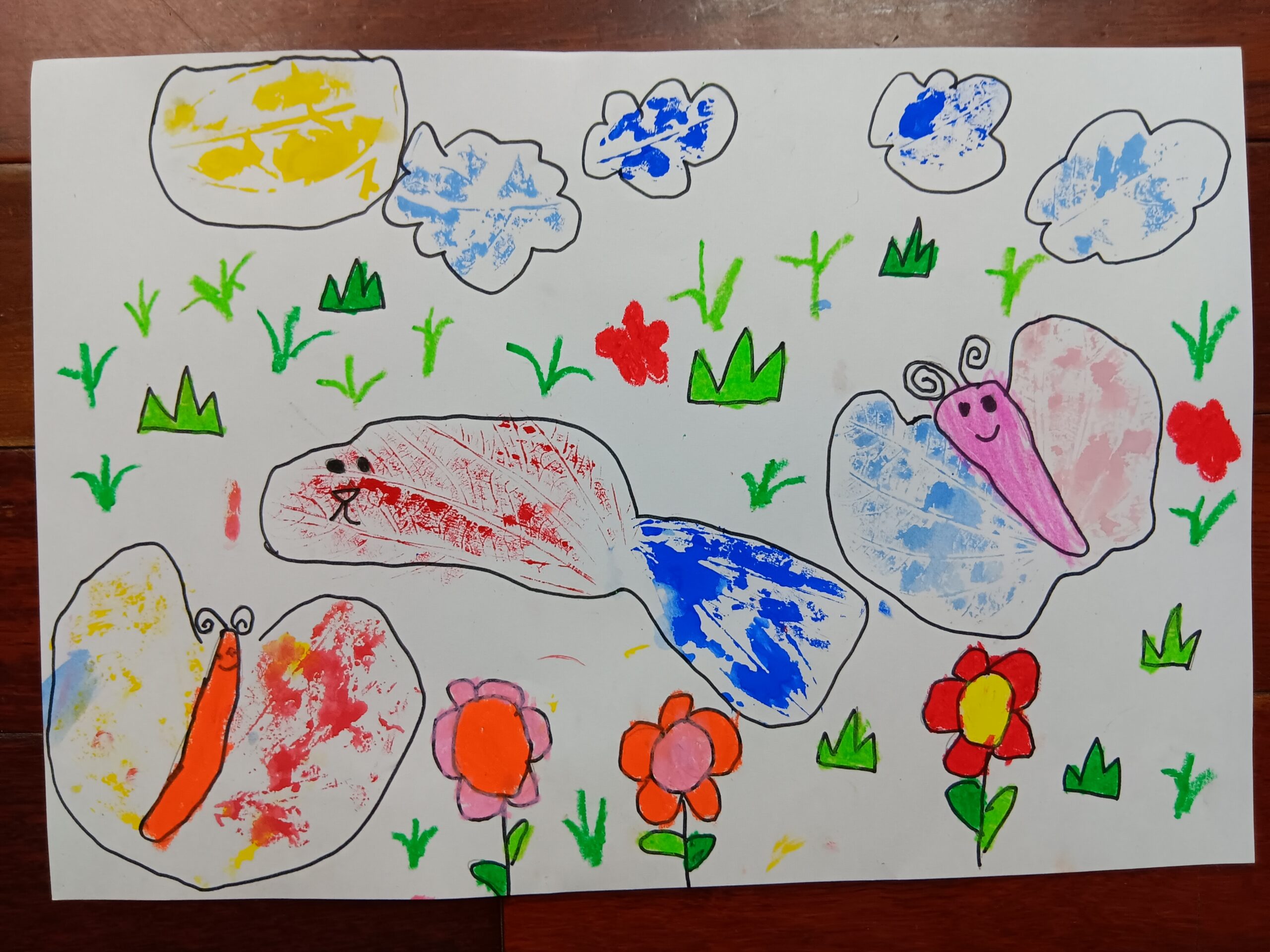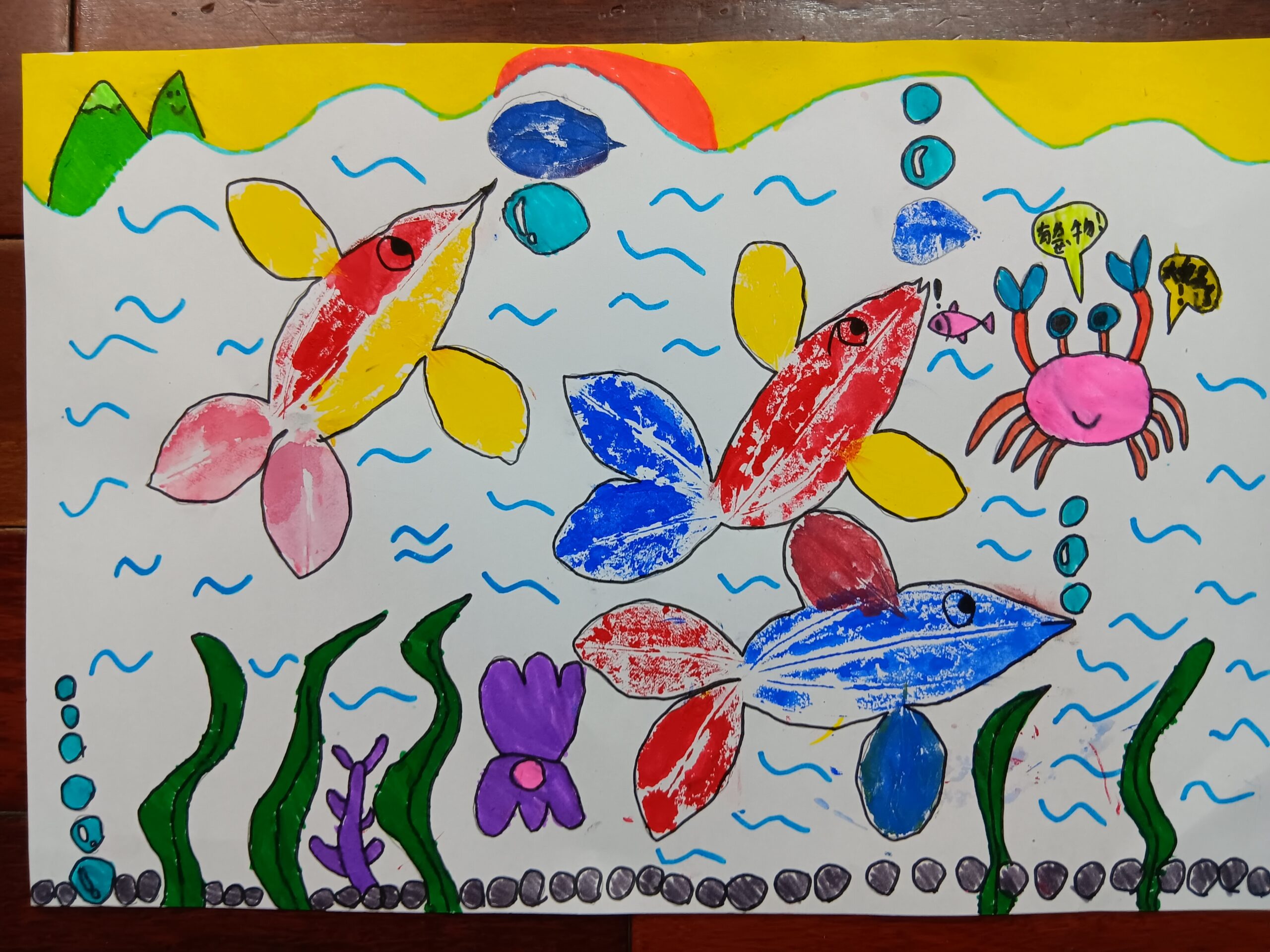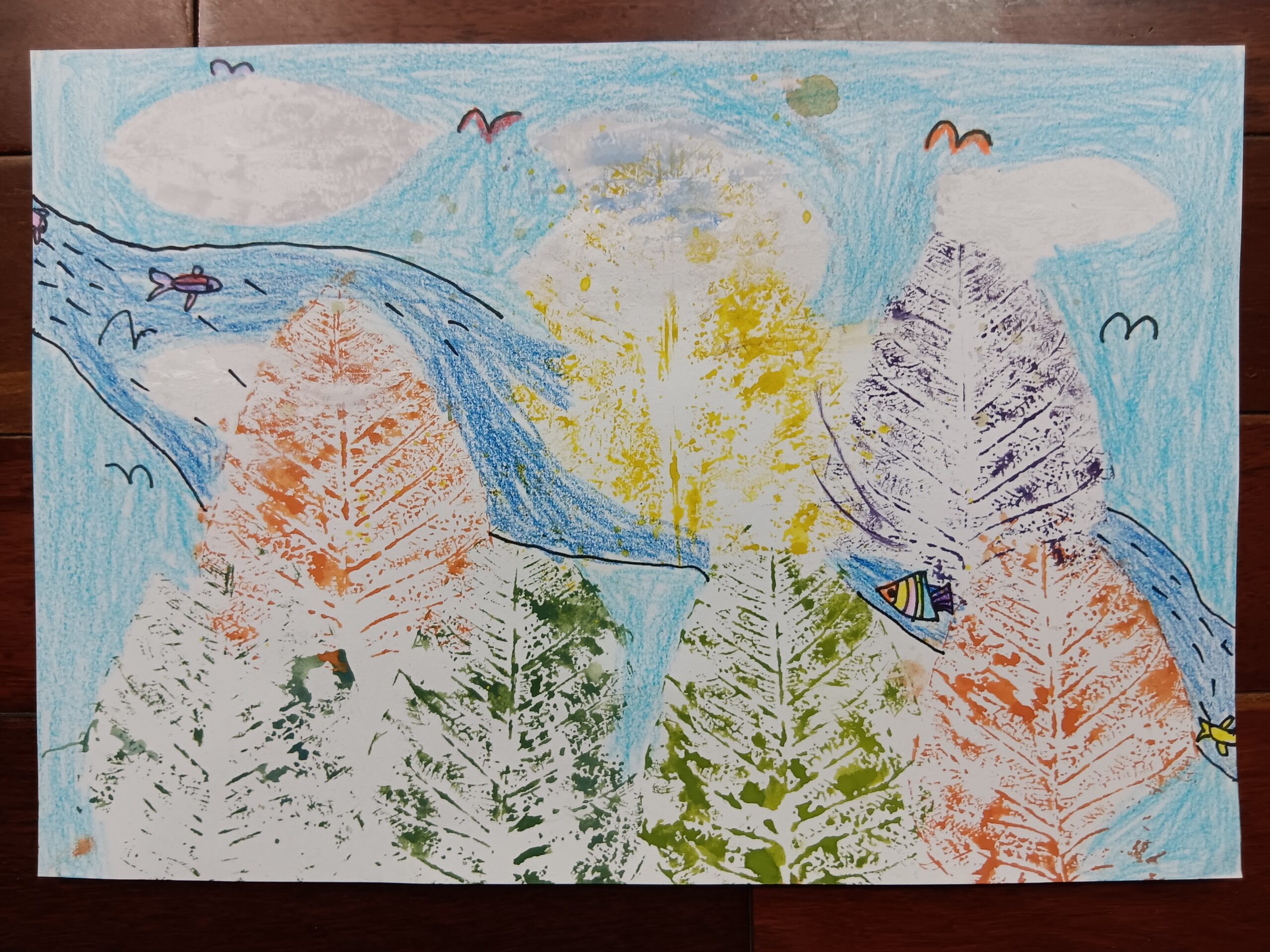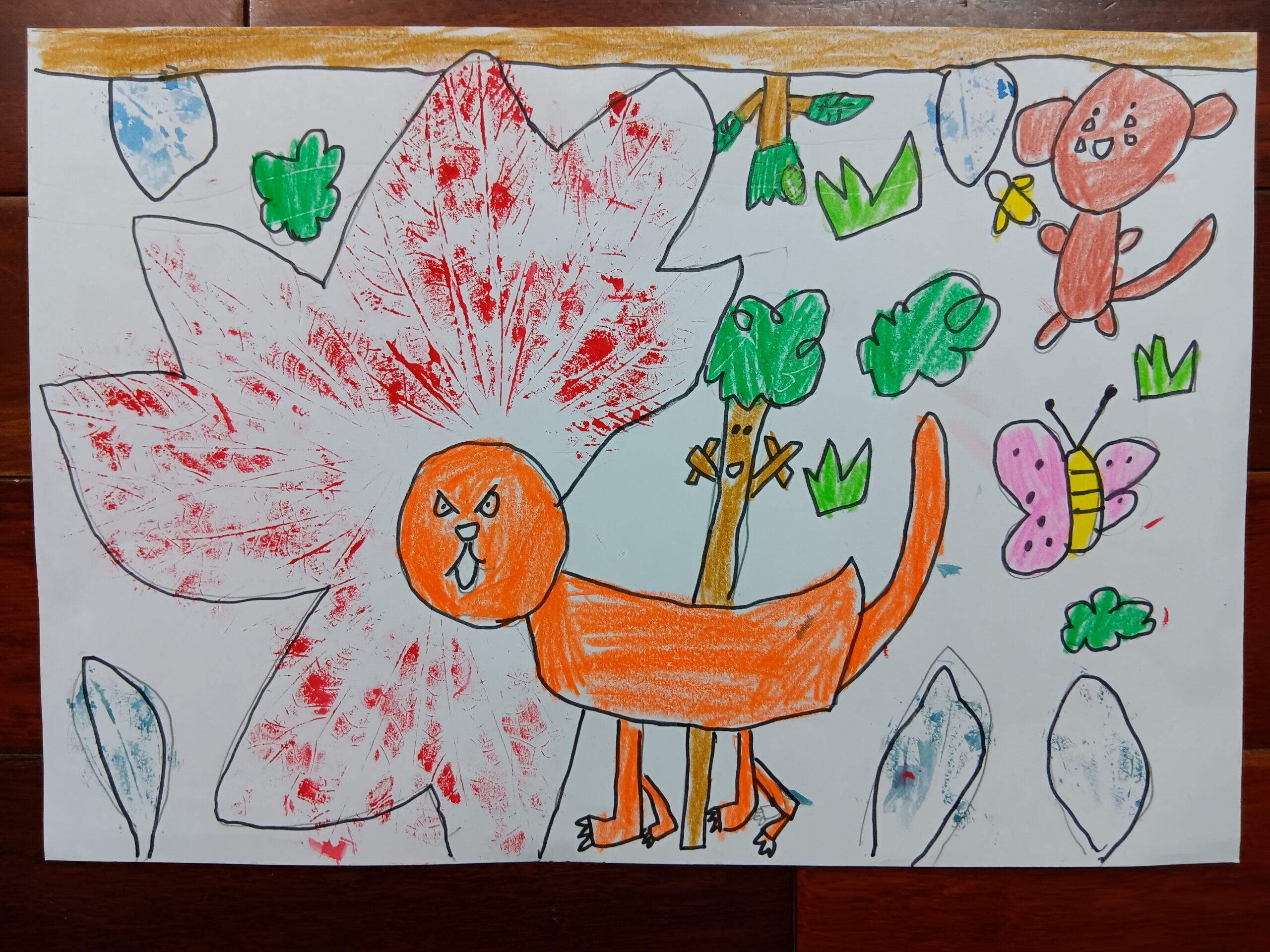 葉子拓印創意畫2024 年 1 月 10 日 林冠妙昨天老師帶小朋友到校園撿各種不同形狀的落葉,今天老師教小朋友在葉子塗上水彩,將葉脈拓印在圖畫紙上,再用拓印的葉子創作拓印畫。小朋友想像力很豐富,各種不同形狀、大小的葉子設計成魚、獅子、蝴蝶、大樹、高山、海洋生物……等,鮮豔的色彩讓圖畫變得更生動了!小朋友的創作很棒喔!