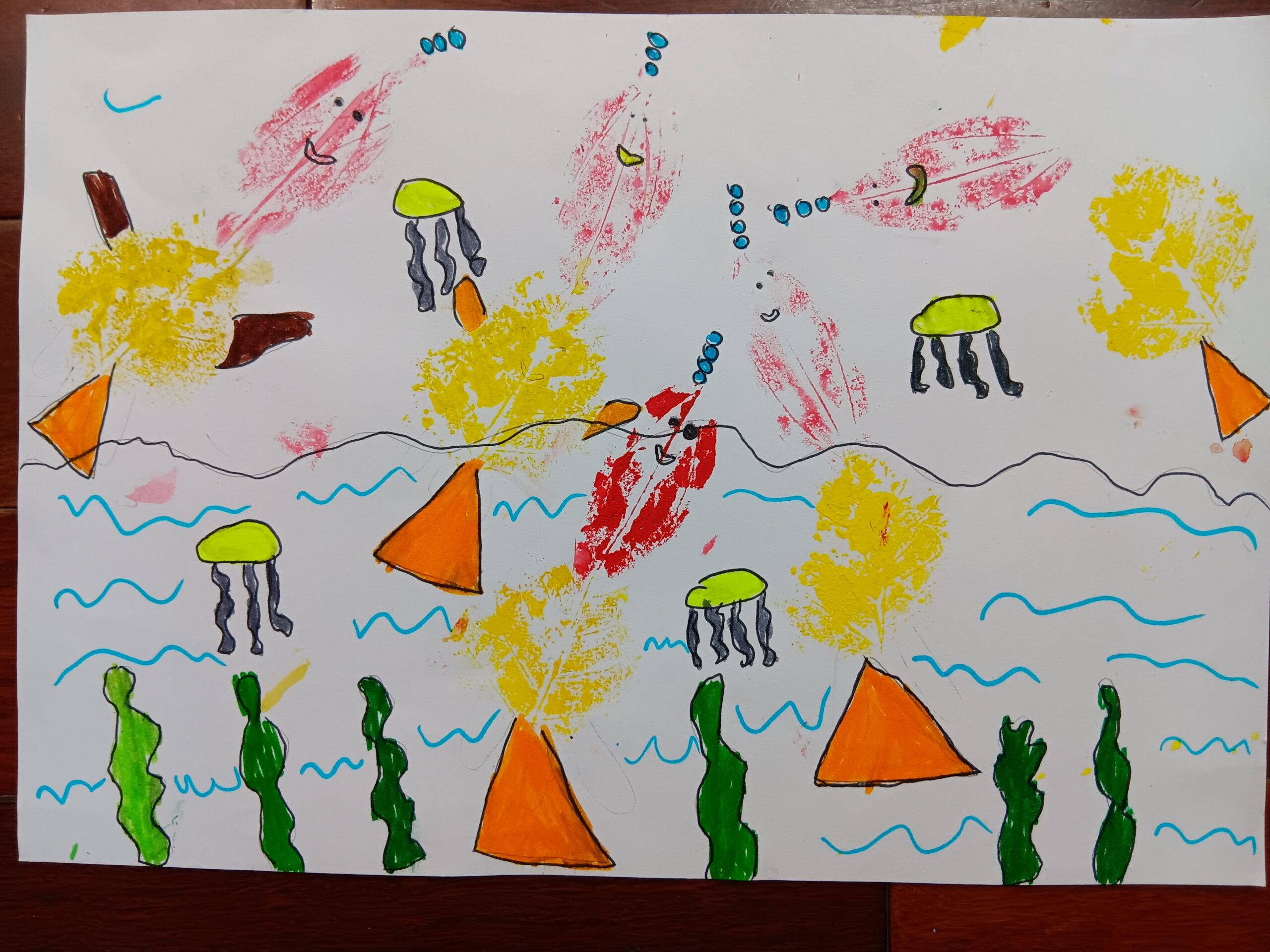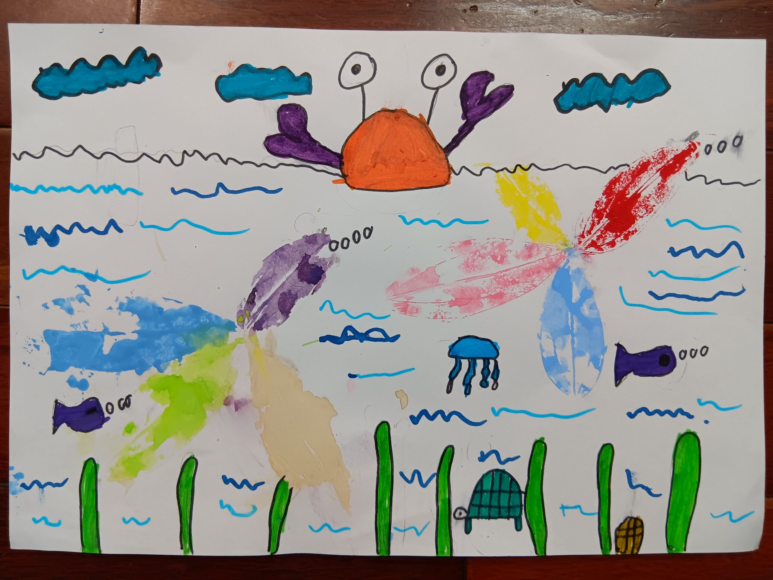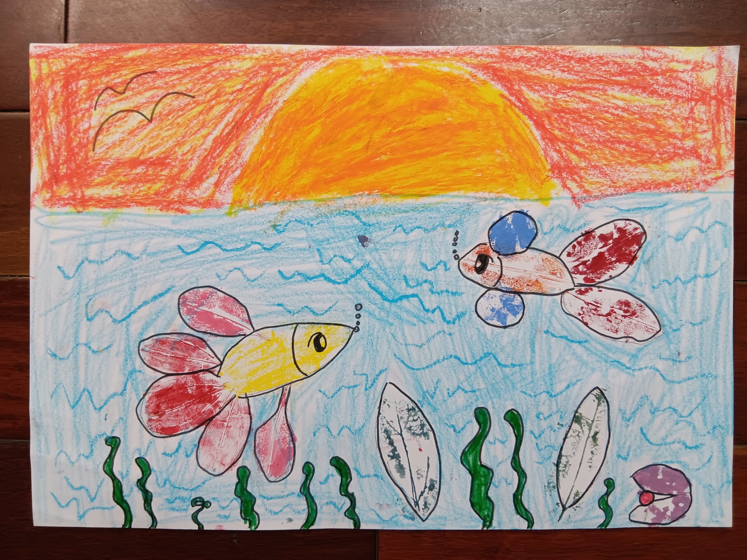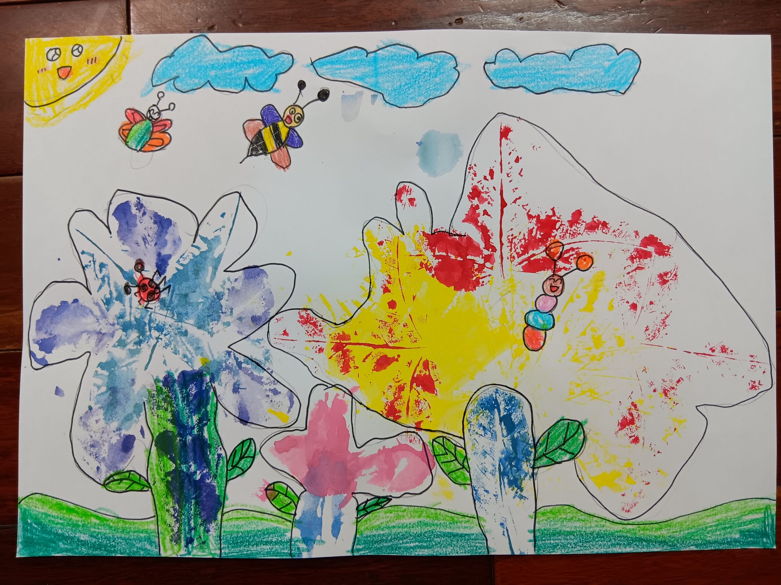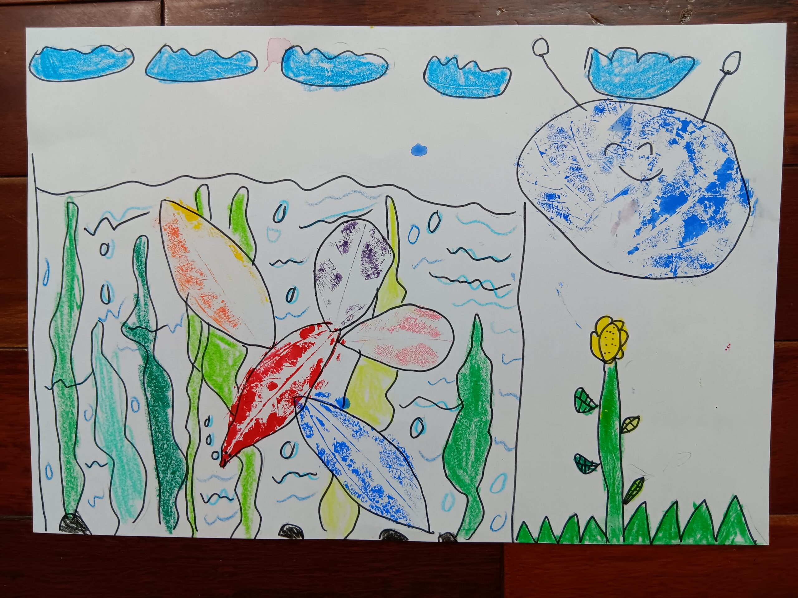 葉子拓印創意畫2024 年 1 月 10 日 林冠妙昨天老師帶小朋友到校園撿各種不同形狀的落葉,今天老師教小朋友在葉子塗上水彩,將葉脈拓印在圖畫紙上,再用拓印的葉子創作拓印畫。小朋友想像力很豐富,各種不同形狀、大小的葉子設計成魚、獅子、蝴蝶、大樹、高山、海洋生物……等,鮮豔的色彩讓圖畫變得更生動了!小朋友的創作很棒喔!