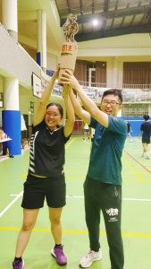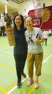 第二屆鮮奶盃羽球賽10/30於活動中心開打,學校教職員工開心同樂,最後由專任辦公室強拍組合~昱宣及湘慧老師贏得靖雲理事設計的霸氣獎盃!