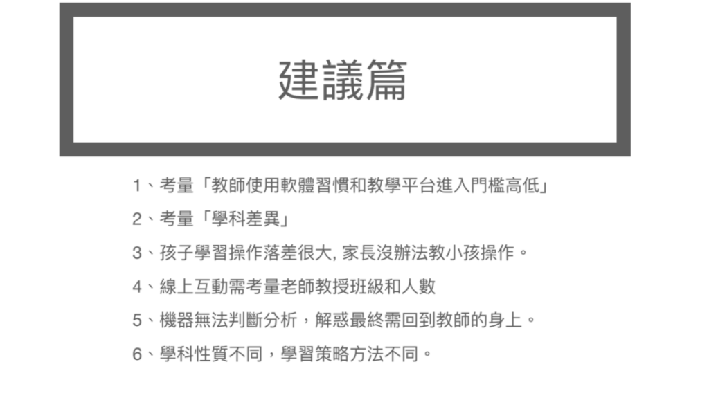 ?宜蘭縣教育處要各領域思考如何因應停課後學生的學習。當時輔導團關注四個面向,一、哪些教學策略可運用在線上學習;二、如何線上班級經營;三、有哪些軟體或線上平台可使用和如何操作;四、各領域擬出線上課程與教學技巧。2013年因實施翻轉教室給我很多實踐經驗,我考量的面向:哪種類型老師會使用線上平台?進入科技門檻高低?科技操作視覺性和繁雜性?使用時遇到卡關,教師排除問題能力和誰能協助?大中小校的學習文化和進場模式?學科屬性不同,線上課程操作難度不同……等等。