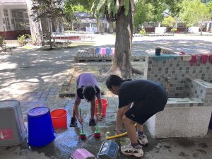 我們趕緊用流出來的水來刷垃圾桶,沒有浪費水資源喔!
