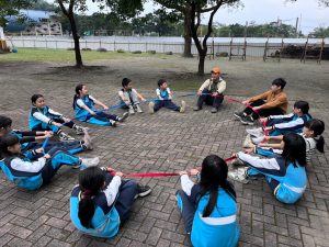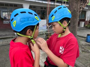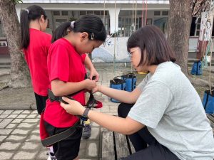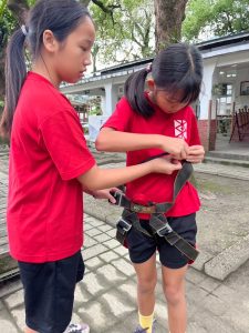 在穿戴安全裝備的時候,我們互相幫同學檢查有沒有拉緊,