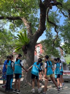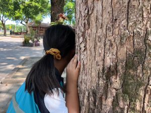 老師帶我們到教室外去摸樹、看樹、聞樹和抱樹,