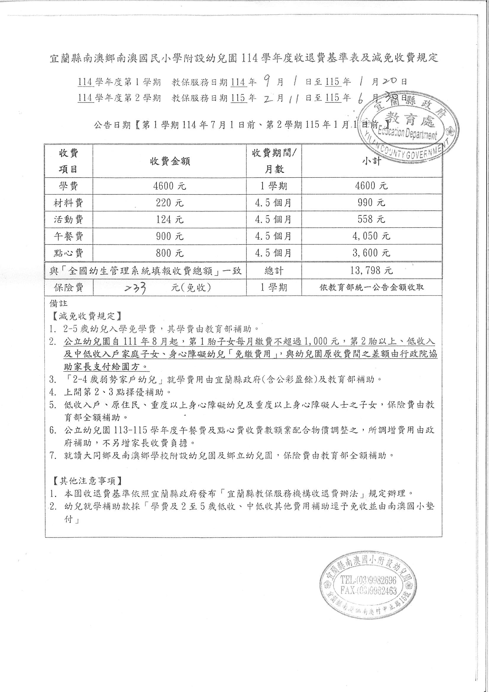 114學年度 宜蘭縣南澳國小附幼 收費基準表