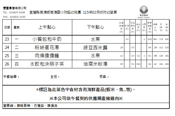 餐點表 2026 年 2 月 21 日2026 年 2 月 23 日 作者: 宜蘭縣南澳鄉南澳國民小學附設幼兒園