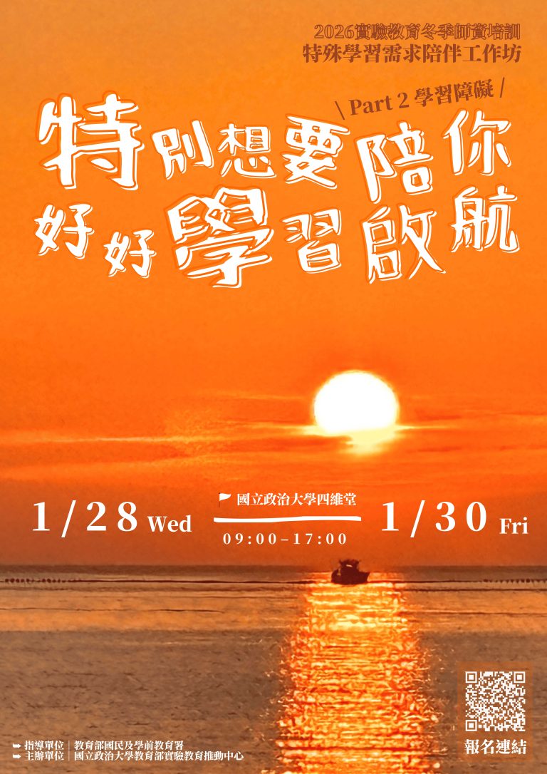 【轉知】教育部實驗教育推動中心舉辦2026年實驗教育冬季師資培訓課程「特殊學習需求陪伴工作坊」,請查照。