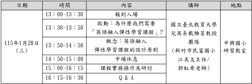 114-1 英語融入彈性學習課程概念與設計研習/ Concepts and Design for Integrating English into School-Based CurriculumPost author:游語萱Post published:2025 年 12 月 26 日Post category:研習資訊/Workshop115年1月28日 (三) 13:30-16:30EIP報名連結: https://co.ilc.edu.tw/t24664 公文連結: https://drive.google.com/file/d/1LK4jlDAnWtAY_889BefCDgT2RUusk-VK/view?usp=drive_link計畫連結: https://drive.google.com/file/d/17ZZDYrn50HXEda38-13J8S8SfQNGDlPt/view?usp=drive_link相關內容酷英平台11月系列研習及AI教育科技展 歡迎踴躍參加喔2024 年 11 月 1 日宜蘭縣111學年度「英語融入彈性」校訂課程發展研習計畫-第一場次/Workshop for School-developed Required Course of “Integrating English into Alternative Curriculum” in School Year 111-Session 12022 年 11 月 21 日【轉知】─教育部111年度國中小英師增能工作坊第2梯次報名/FWD-MOE Workshop for JH/ES English Teacher in 20222022 年 9 月 22 日